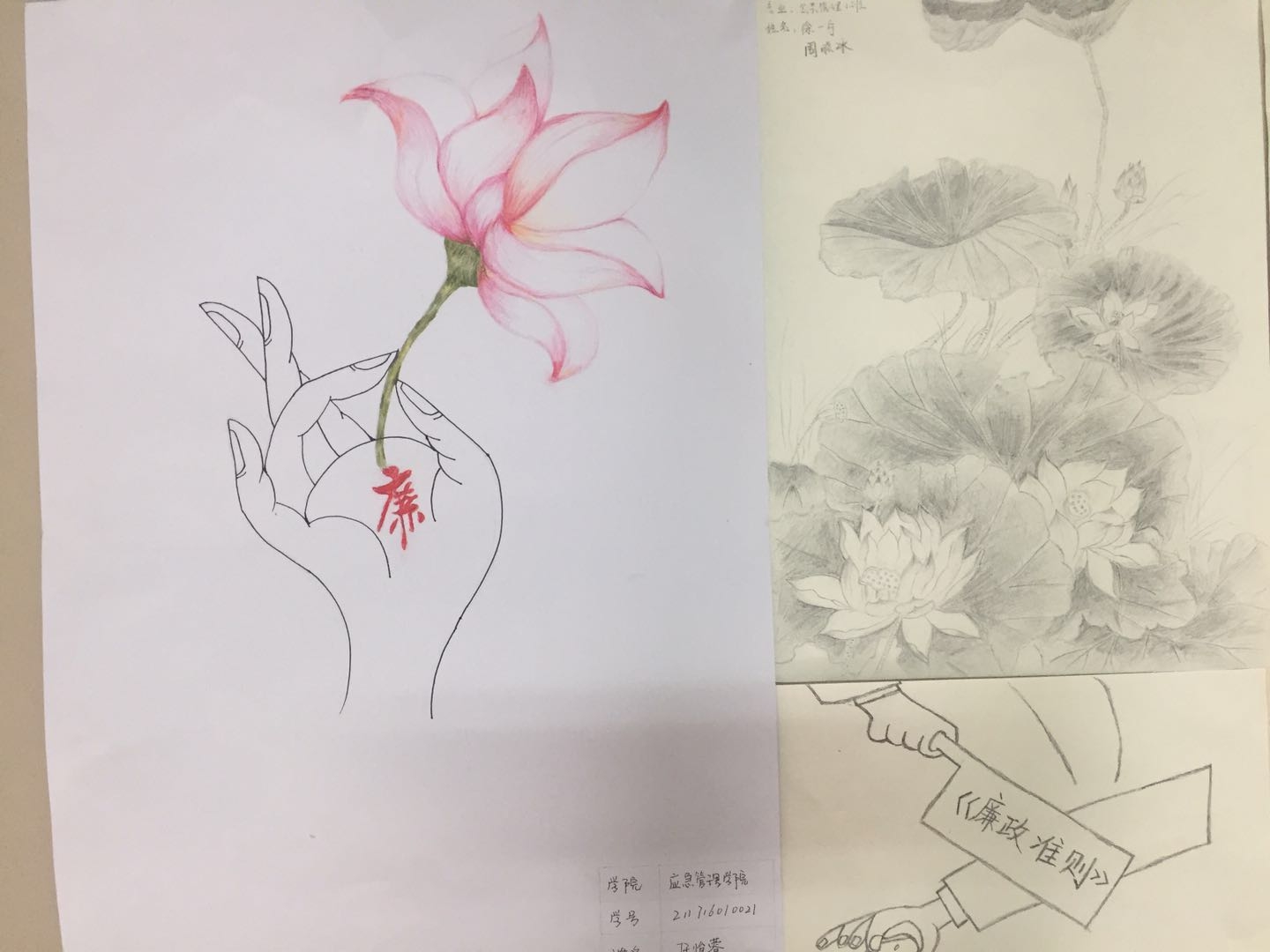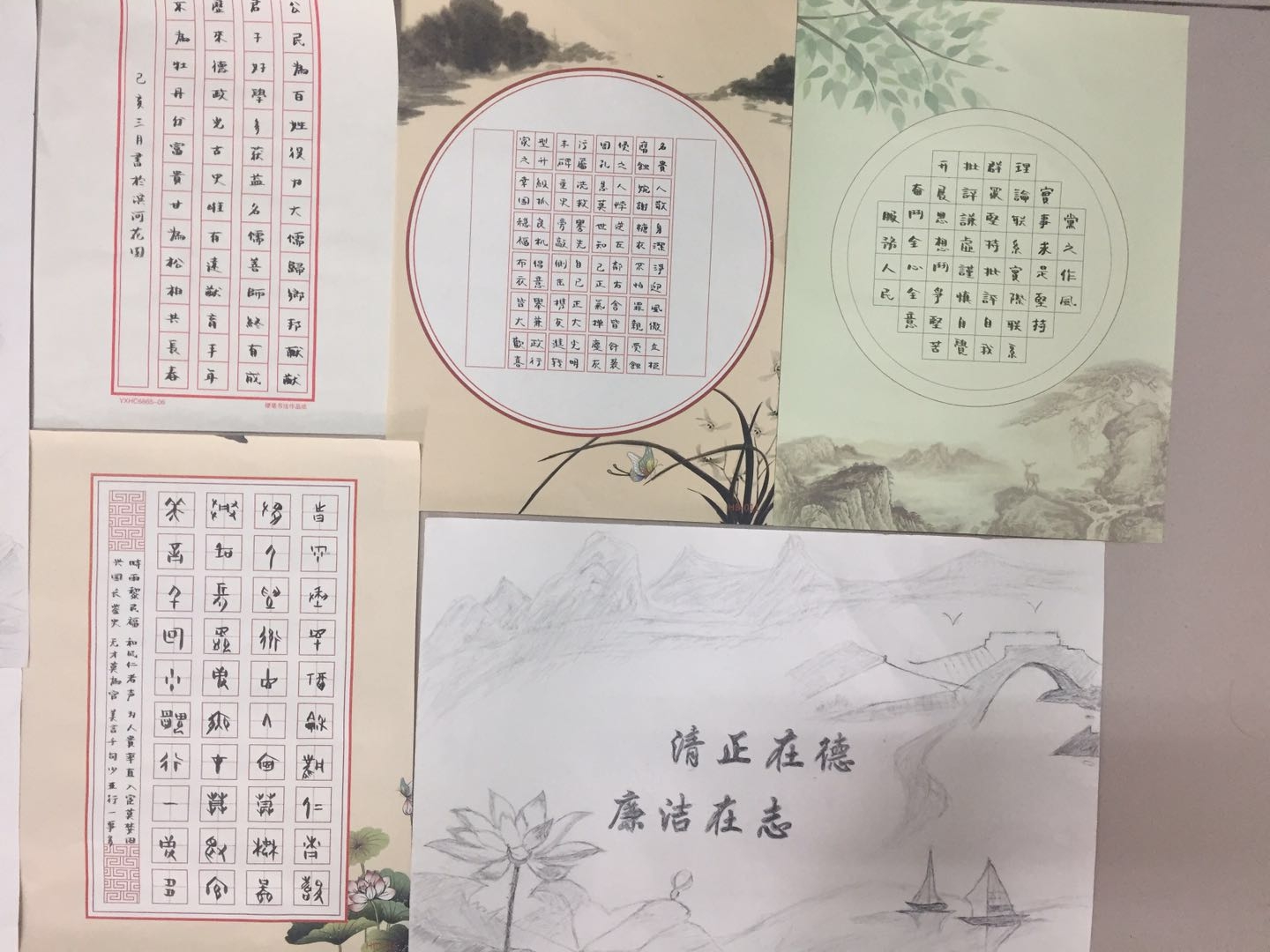 学院师生积极参与作品投稿,创作以廉洁勤政为主题的书法绘画作品。本次比赛共收集到廉洁书画作品30幅。在比赛中,师生通过铅笔画、简笔画、水粉画、硬笔书法、软笔书法等形式,紧贴主题,大胆创新,生动形象的表达了崇尚诚信、廉洁从政的思想。“拒腐蚀,婉谢糖衣,不怕罪亲”、“倡意举,兼政行”、“清正在德,廉洁在志”等字眼,主题鲜明,时刻提醒着党员干部要“清廉政务,坚持原则”,常怀律己之心,立足本职岗位,增强勤政廉政观念,传播廉洁廉政文化。经学院评审小组层层筛选,优中选优,最终评选出一等奖一个,二等奖二个,三等奖三个,共六个书法绘画作品。