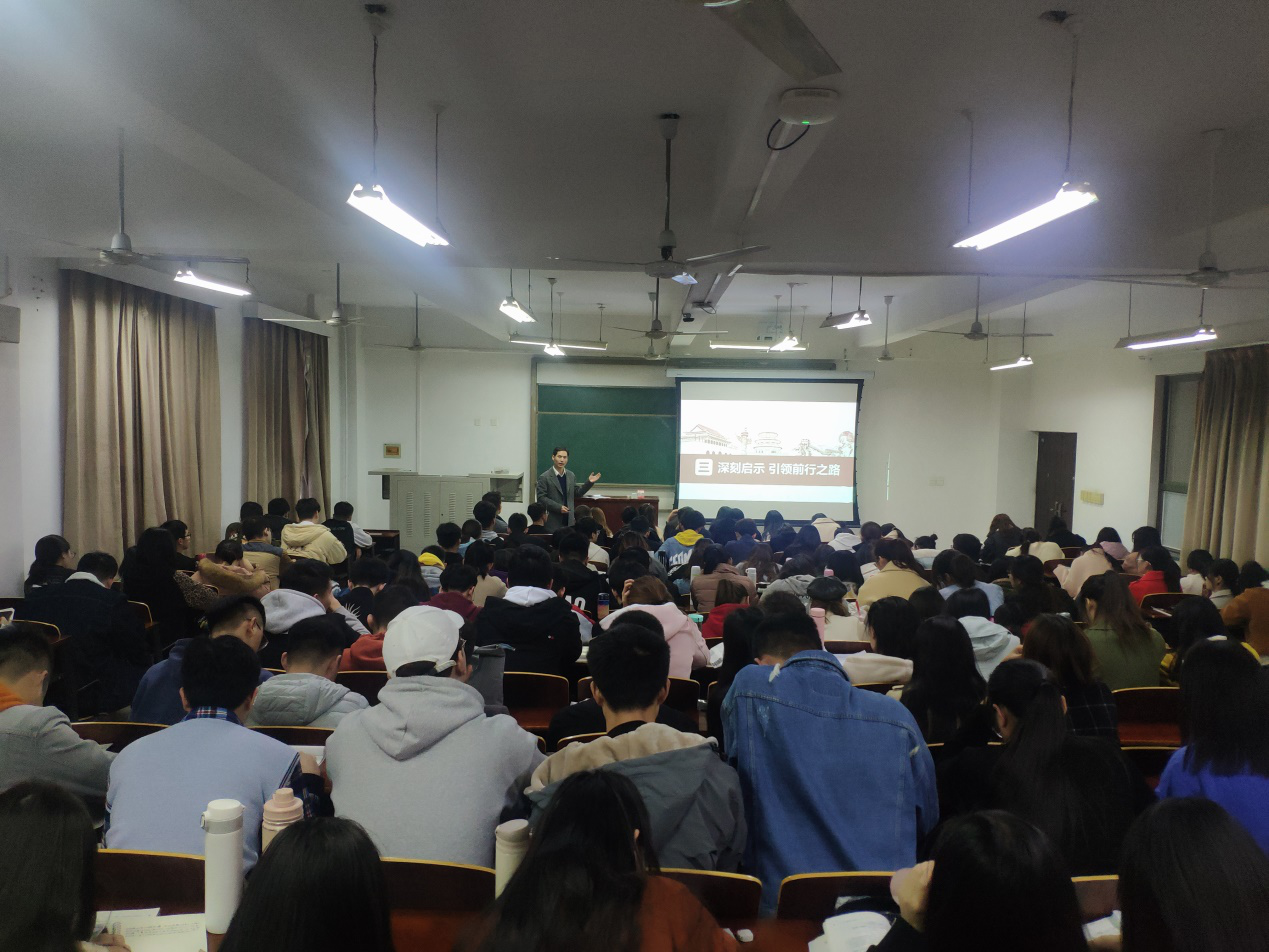 讲座上,陈昊主要围绕“艰辛探索,铸就辉煌历程”“砥砺奋进,谱写壮丽史诗”“深刻启示,引领前行之路”三个篇章深入阐述了新中国成立70年来的光辉历程。首先,他带领大家回顾了新中国从成立之初的积贫积弱、封闭落后,到通过改造和建设奠定根本政治前提和制度基础,实行改革开放、开创推进和发展中国特色社会主义,再到开辟新时代、奋力实现中华民族伟大复兴的新中国艰辛探索的辉煌历程。接着,陈昊运用详实的数据和丰富的事例向同学们展示了新时代下中国谱写的砥砺前行、奋发图强的壮丽史诗,总结出新中国成立以来的伟大成就:经济建设创造“中国奇迹”、政治发展道路越走越宽广、社会主义文化繁荣兴盛、让百姓有更多获得感、生态文明建设进入快车道。最后,在启示篇章,对于我们国家70年来发生的翻天覆地的变化,陈昊总结出四个方面的原因:一是中国特色社会主义是党和人民胜利前进的光辉旗帜,是国家富强、民族振兴、人民幸福的必由之路。二是中国共产党是中华民族的脊梁,是中国人民的主心骨,是我们各项事业取得胜利的根本保障。三是改革开放是一场新的伟大革命,是发展中国、赢得主动、走向世界、面向未来的根本途径和强大动力。四是人民群众是国家和社会的主人,是历史的创造者,是推动社会历史前进的决定性力量。