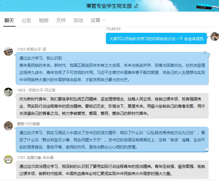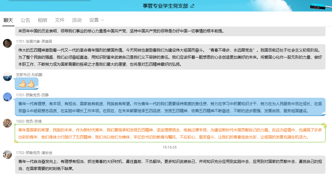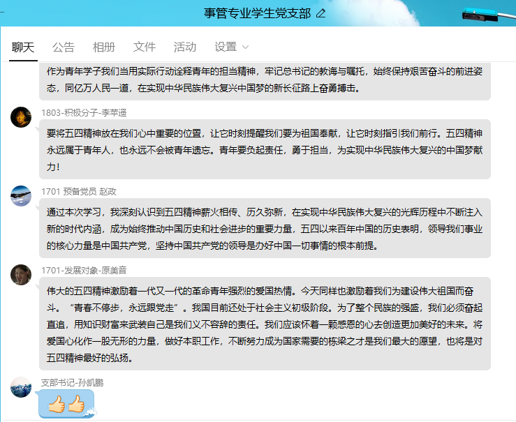 为深入学习贯彻习近平总书记五四寄语精神,发挥支部成员在我院广大学生群体中的思想引领作用,应急管理学院学生党支部于2020年5月19日下午开展了“学习五四精神”理论学习活动,依托党支部QQ群、学习强国平台,组织全体党员、预备党员、发展对象和入党积极分子共同参与。