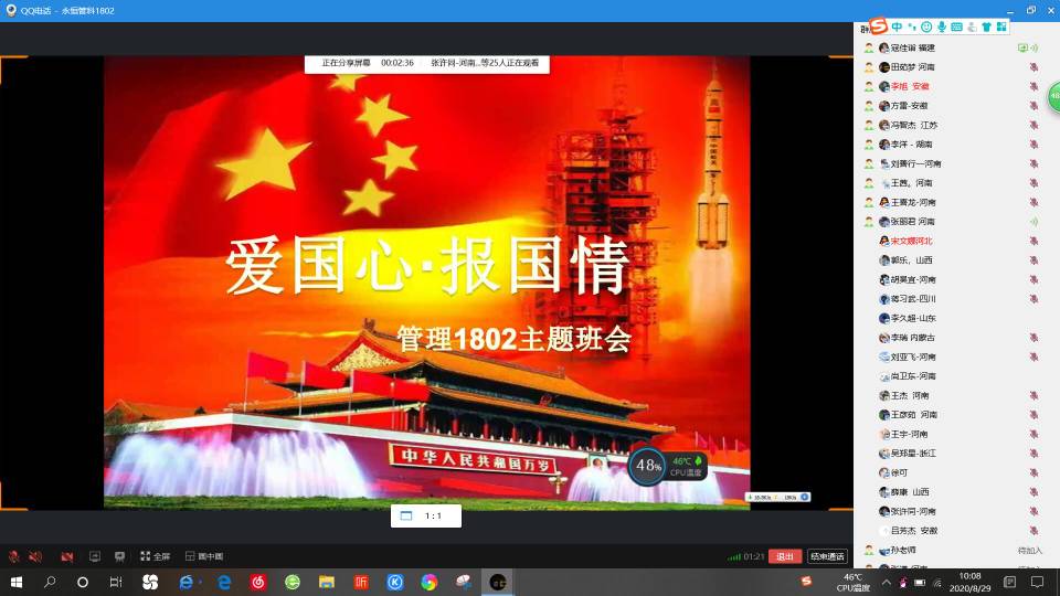 习近平总书记曾指出,爱国主义是中华民族精神的核心。爱国主义精神深深根植于中华民族心中,是中华民族的精神基因,维系着华夏大地上各个民族的团结统一。为激励一代又一代中华儿女为祖国发展繁荣而不懈奋斗,为根植爱国主义种子,2020年8月29日-9月1日,学院在校生各年级陆续召开以爱国主义为主题的网络班级会议,本次会议由各班班长和团支书共同主持召开,班级全体成员共同参与。