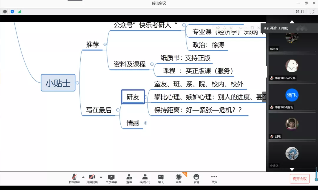 为提高学生对于考研的重视和认识,帮助同学们为考研做出合理的安排与准备,9月12日,我院通过腾讯会议召开了线上考研经验交流会。四位考研上岸的16级优秀毕业生受邀为同学们解答疑惑,传授经验。学院各专业有志于考研的同学参加学习。