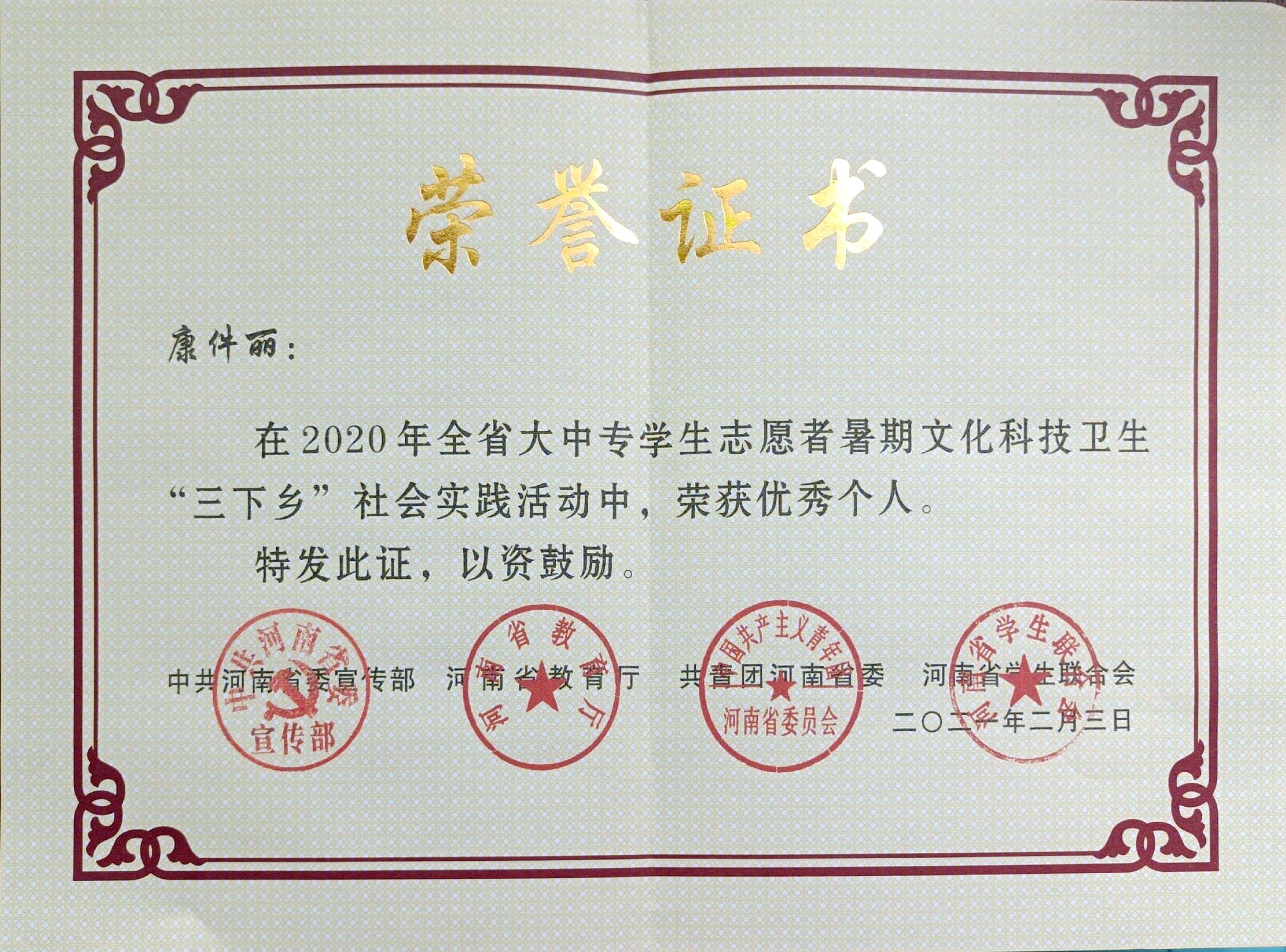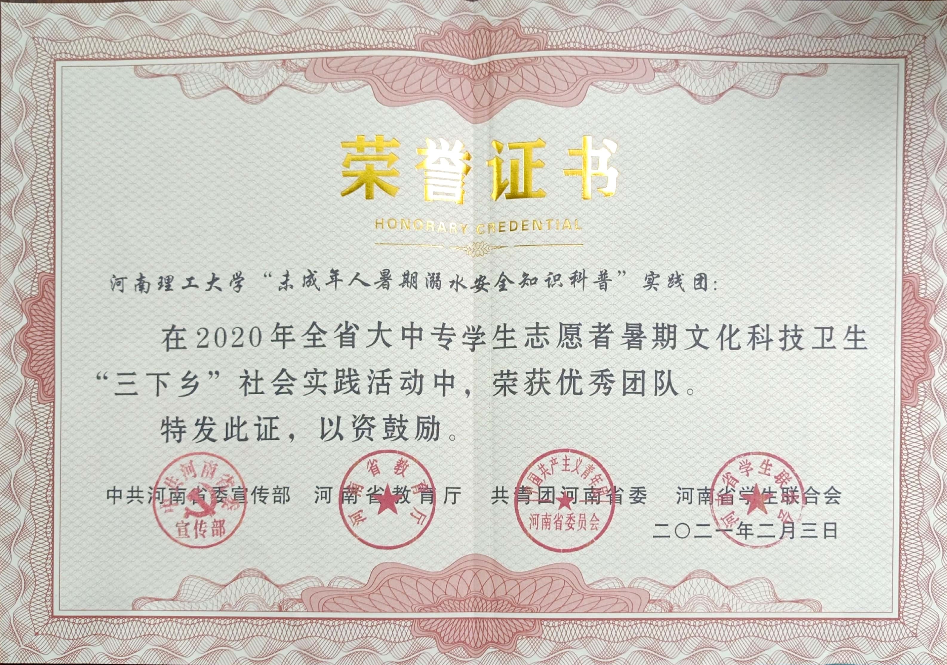 近日,中共河南省委宣传部、河南省教育厅、共青团河南省委和河南省学生联合会联合发文《关于2020年全省大中专学生志愿者暑期文化科技卫生“三下乡”社会实践活动的通报》,应急管理学院“未成年人暑期溺水安全知识科普”实践团荣获优秀团队称号,团队指导老师康件丽荣获“2020年全省暑期‘三下乡’社会实践活动“优秀个人”称号。