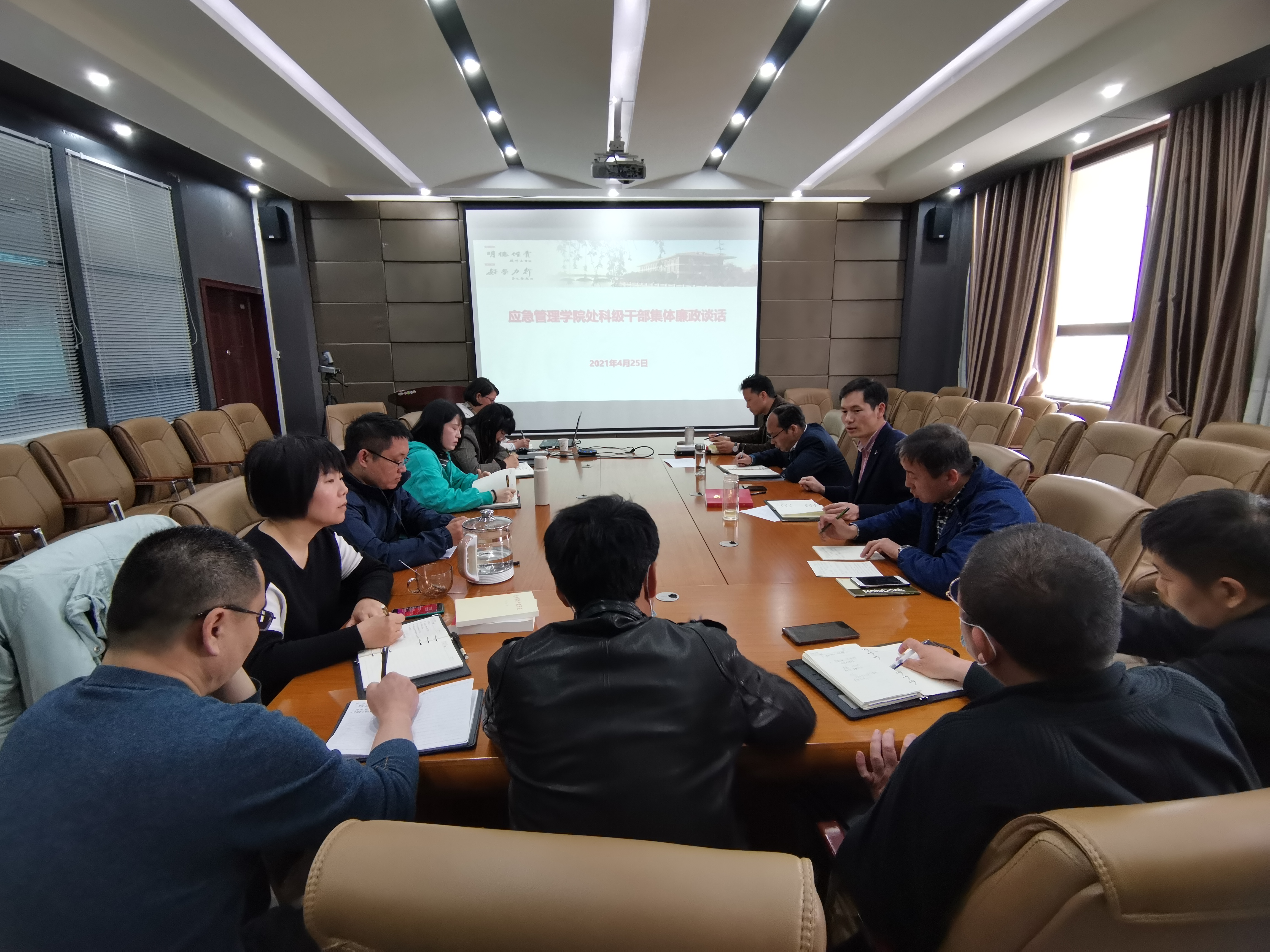 4月25日,应急管理学院党委在文综楼518会议室开展干部集体廉政谈话,谈话由学院党委书记陈昊主持,全院科级以上干部参与谈话。