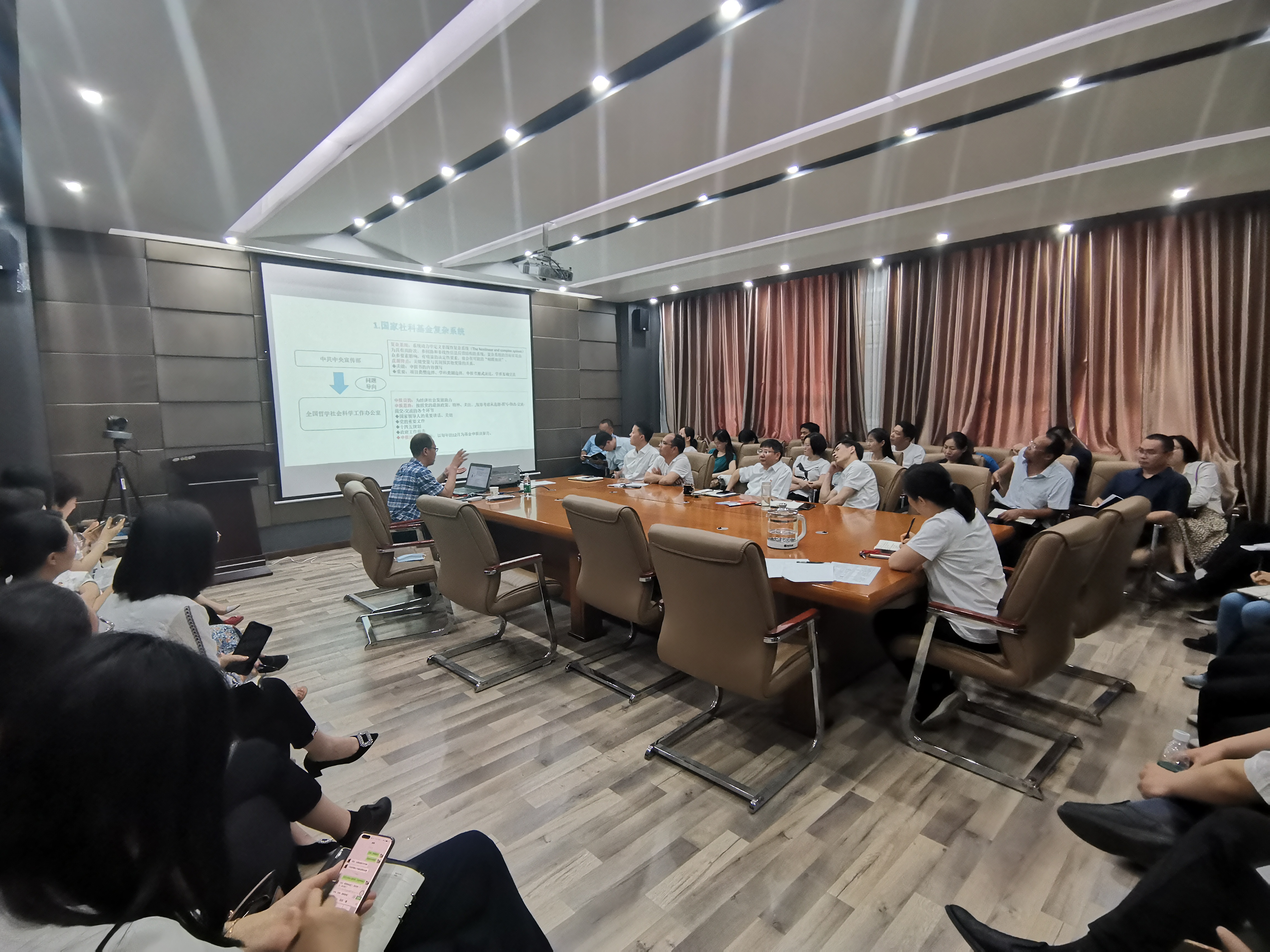 会上,王守文首先结合自身申请经历对基于复杂系统的国家社科基金项目作了全面的介绍,并围绕基金复杂系统、项目类型、学科类别、内容构成、学界互动五个方面,从学术研究的规范、路径和方法三个维度,就项目中常出现的问题逐一进行了深入的剖析和讲解。他强调,国家社科基金的申报要做到选题有新意、研究有基础、论证有逻辑、文本有条理,鼓励与会教师要转变思路,积极申报基金项目。王守文的报告蕴含着学术思政、案例教学等思想,精彩独到、诙谐幽默,赢得了与会人员的阵阵掌声。