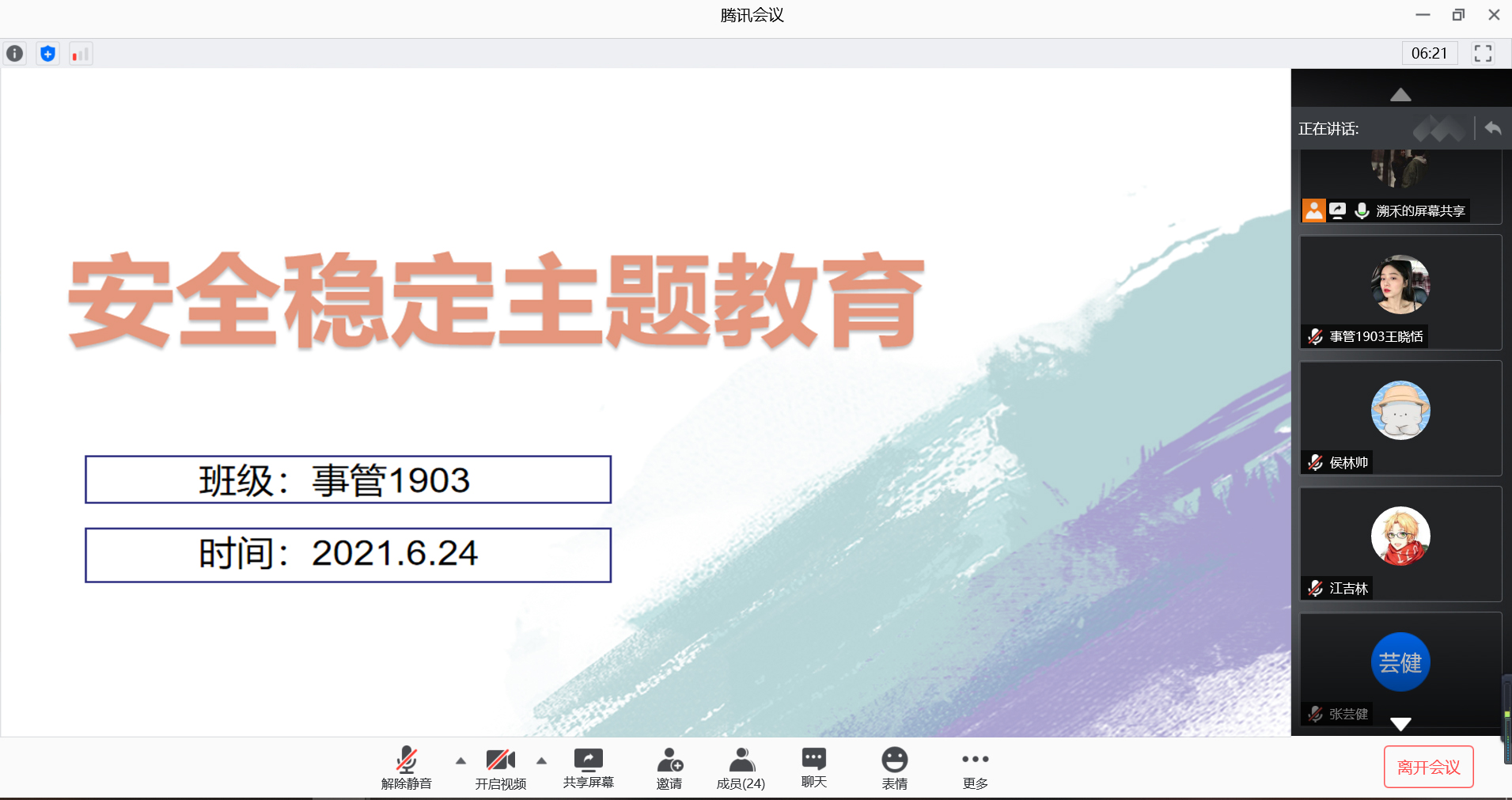 为切实增强学生校园安全防范意识,提高学生校园安全防范能力,着力构筑平安、和谐、稳定校园,我院于6月23-25日在各级辅导员通过线上、线下形式召开“安全稳定主题教育班会”。