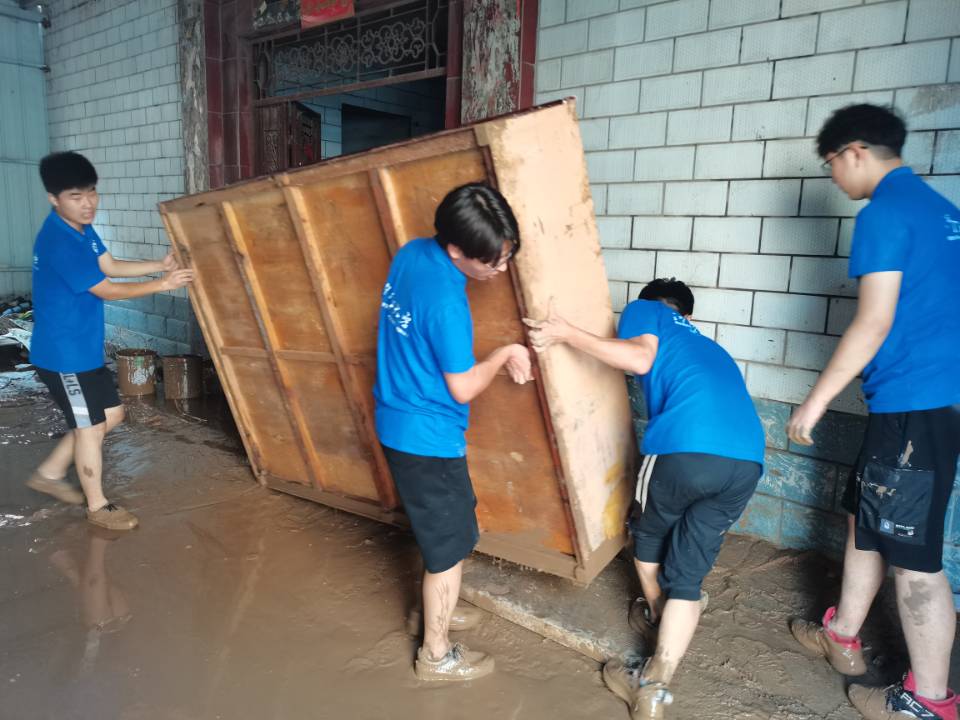 在抢险救灾形势严峻的恩村一街里,实践团成员不畏艰苦,迅速分配任务,协调合作,主动承担起清淤、排水等工作。他们不顾坎坷泥泞的道路和浑浊的积水,用扫把、铲子、铁锹等多种工具,对房屋及道路进行铲土、清障、填装、清理垃圾。“面对自然灾害,我们从不畏惧,因为我们有战胜它的信心和团结一致抗灾的决心。这次的防汛减灾志愿活动将是我们人生中最有意义、最为宝贵的一课,也是我们终生受用的一课。”实践团学生党员任少通、孔震乾、祁义飞难掩对公益志愿服务的热忱激动地表示。最终,实践团成员共疏通沟渠100余米长,铲运垃圾20余车,打扫房间10余间,圆满完成了本次志愿服务活动。志愿服务结束后,恩村一街村民及工作人员向实践团成员表示感谢并合影留念。