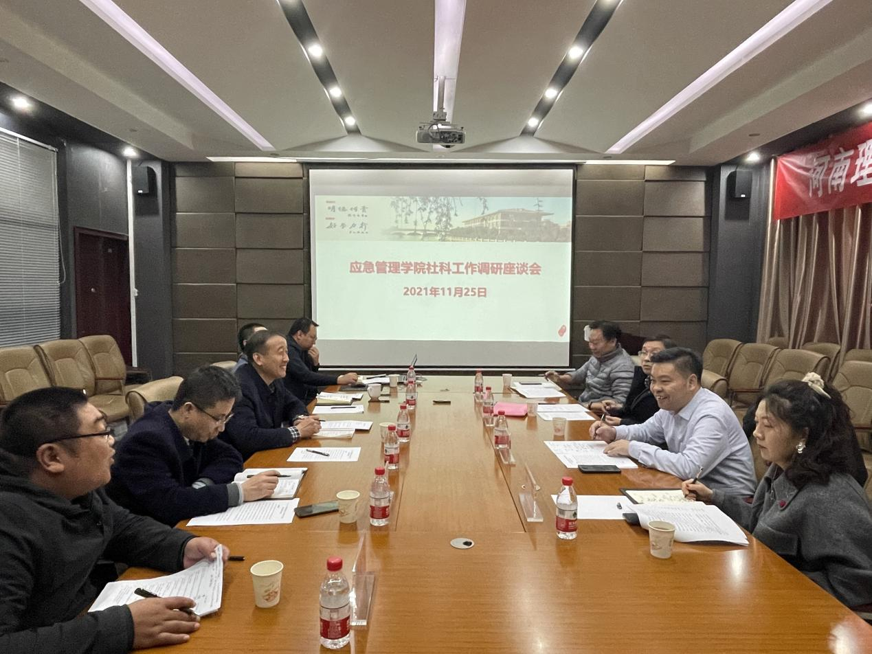 学院执行院长张小兵汇报了学院发展历程、师资队伍培养、学科与学位点建设、科研工作等方面的基本情况,从管理体制重塑、学位点培育等方面分析了目前亟待解决的问题。应急系主任钱洪伟分析汇报了国内应急领域发展现状、存在的不足及学院自身下一步发展思路。刘德林教授围绕人才培养、团队塑造、科研服务等方面,表态会发挥学院优势,努力做好社科工作,争取为学校打造应急管理特色品牌贡献更多力量。顾令爽老师立足应急管理特色科研,从社会服务与成果评价方面提出了合理化的建议。另外,与老师从高级别项目申报、领军人才与科研团队培育、高层次成果奖励培育、科研平台建设、社会服务等方面提出了存在的问题和相关建议。