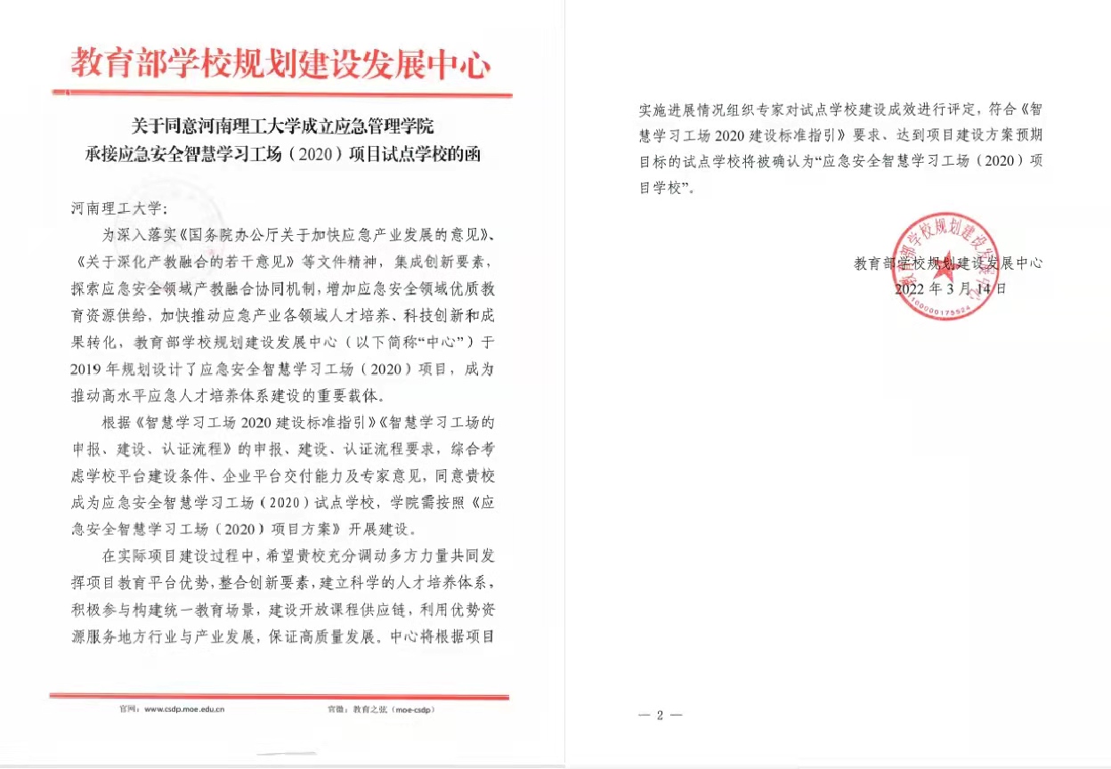 3月14日,教育部学校规划建设发展中心来函通知,同意《河南理工大学关于增列“应急安全智慧学习工场”项目暨“应急管理学院”的请示》,确认我校为“应急安全智慧学习工场”项目试点单位。