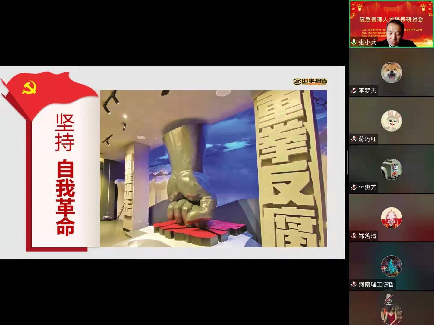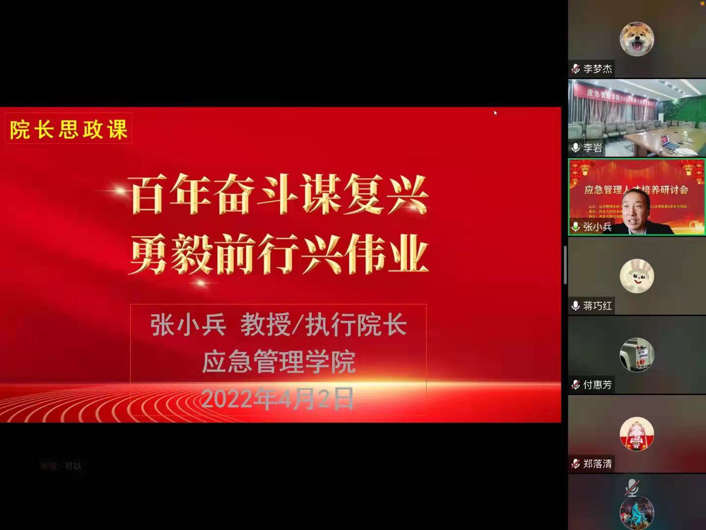 4月2日,应急学院执行院长张小兵教授以“百年奋斗谋复兴,勇毅前行兴伟业”为题主讲思政课。本次授课通过线上教学方式进行,学院公共管理学硕、全日制教育硕士共40名研究生全程听讲学习。