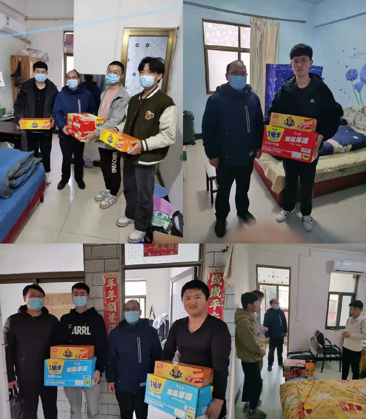 在实习学生宿舍内,赵观石将慰问品送到同学们手中,并代表学院对他们表示亲切的问候。在与学生交流的过程中,赵观石和一行教职工仔细聆听了学生在心理和生活中存在的问题,了解他们的困难,并对其进行心理上的疏导,为他们解读疫情防控相关政策,他指出,当前疫情反复,形势严峻,要在做好防护的同时又做好实习工作,是一项艰巨的考验,因此,同学们要关注时事,锻炼能力,顺利度过这一特殊时期。他鼓励要准备考研复试的同学们,抓紧时间做好充分准备,争取在复试上做出突出表现,顺利通过考研复试。同时,赵观石叮嘱同学们在宿舍要注意用电安全,外出实习时要注意个人安全,必要时可向学院寻求帮助,争取在毕业前的一段时间里努力学习,积累经验,取得更大的进步。