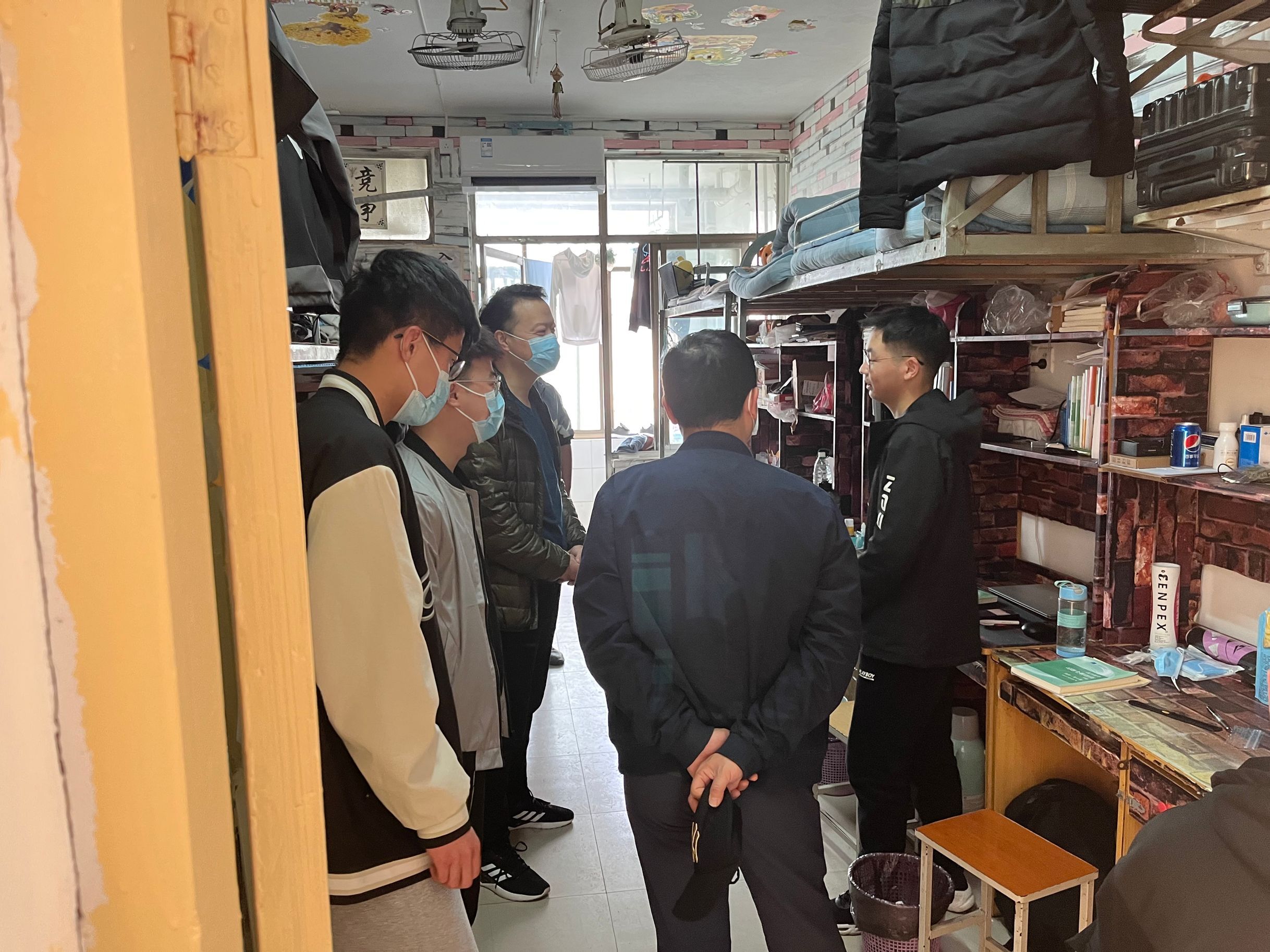 各位领导与老师通过走访,详细了解了同学们在校期间的思想状态、学习情况和生活动态等,引导同学们充分认识当前疫情防控形势的严峻性、复杂性,校园宿舍安全稳定工作的重要性、必要性,同时认真地询问了同学们在各方面的实际困难与需求,并针对如何有效安排时间、调节身心状态等方面给予指导性建议。领导老师嘱咐同学们要做好自身防护,严格遵守学校的相关规定,营造和谐温暖良好学风环境,同时对仍有不足的宿舍提出了整改意见,要求学生重视宿舍卫生及安全用电的习惯。同学们纷纷表示对领导老师们关怀的感谢,并表明一定会遵守学校的相关规定,坚定战疫必胜信心,以积极的心态和健康的体魄投入到学习生活中。