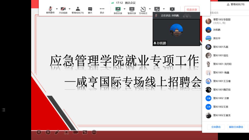 为了帮助我学院2018级毕业生了解自己专业的就业形势和就业方向,增强对自己专业的就业认知和就业信心,提高职场适应能力和就业技能。4月22号晚上9点,我院特别邀请咸亨国际应急科技研究院北京有限公司总经理樊志华、行政主管董梦萍为我院学生做专场招聘会。会议由党委副书记赵观石主持,院学工办主任孙凯鹏和2018级未就业学生参加。