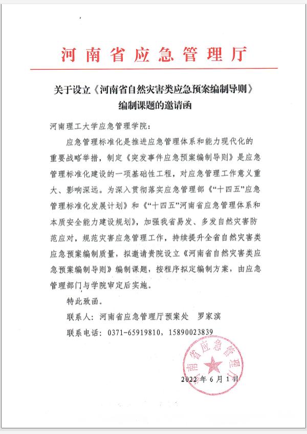 为深入贯彻落实应急管理部《“十四五”应急管理标准化发展计划》和《“十四五”河南省应急管理体系和本质安全能力建设规划》,加强我省易发、多发自然灾害防范应对,规范灾害应急管理工作,持续提升我省自然灾害类应急预案编制质量,我院程书波副教授及其科研团队受河南省应急管理厅邀请,编制《河南省自然灾害类应急预案编制导则》,成果将作为河南省地方标准实施,并择机推荐为国家标准。