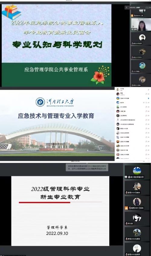 9月10日上午,应急管理学院采取线上方式分专业召开2022级新生入学教育专业介绍会。该院公共事业管理专业、管理科学专业和应急技术与管理专业介绍,分别由该院公共事业管理系系主任孔娜娜、管理科学系系主任揣小明和应急技术与管理系系主任钱洪伟主讲,公共事业管理系、管理科学系和应急技术与管理系教师及2022级全体新生参加。