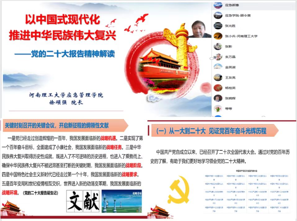 为深入学习宣传贯彻党的二十大精神,进一步加强学院教师创新发展能力提升,1月9日上午,应急管理学院在线上开展寒假教师培训首场报告会,会议由河南理工大学应急管理学院院长、华中科技大学公共管理学院二级教授、博士生导师徐顽强作《以中国式现代化推进中华民族伟大复兴——党的二十大报告精神解读》的主题报告,学院党委书记张光胜主持会议,全体院领导、教职工参加培训。