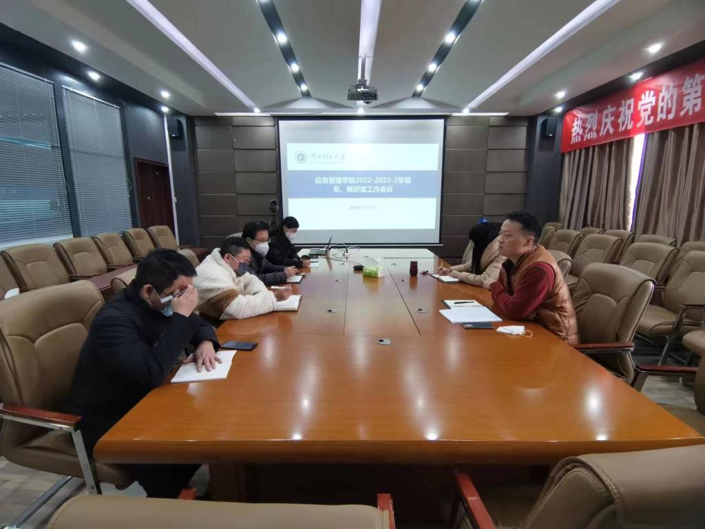 2月13日下午,应急管理学院在文综楼518会议室召开2022-2023-2学期第一次系、教研室教学工作会议,副院长吴晓涛、公共事业管理系主任孔娜娜、管理科学系主任揣小明、应急技术与管理系主任钱洪伟、教科办副主任许荷袖等参加会议。