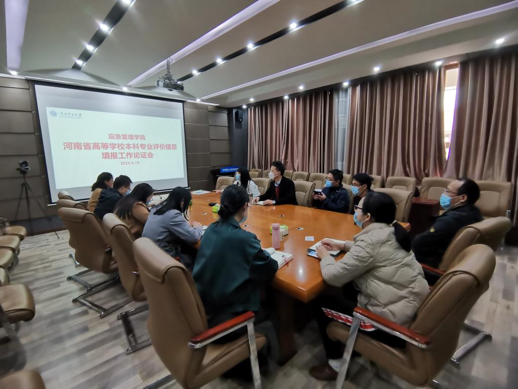 3月15日上午,应急管理学院在文综楼518会议室召开河南省高等学校本科专业评价信息数据填报工作研讨会。副院长吴晓涛、公共事业管理专业、管理科学专业、应急技术与管理专业负责人及数据填报小组成员、教科办工作人员参加会议。会议由吴晓涛主持。