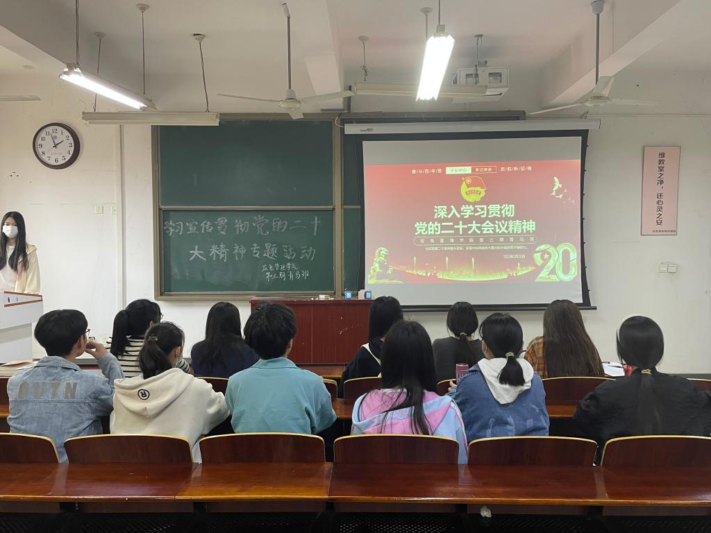 3月28日,应急管理学院第三期青马班学员在文综楼509室开展“学习宣传贯彻党的二十大精神”专题活动,该院青马班全体学员参与专题活动。专题活动由该院第三期青马班班长邵嘉渌主持。