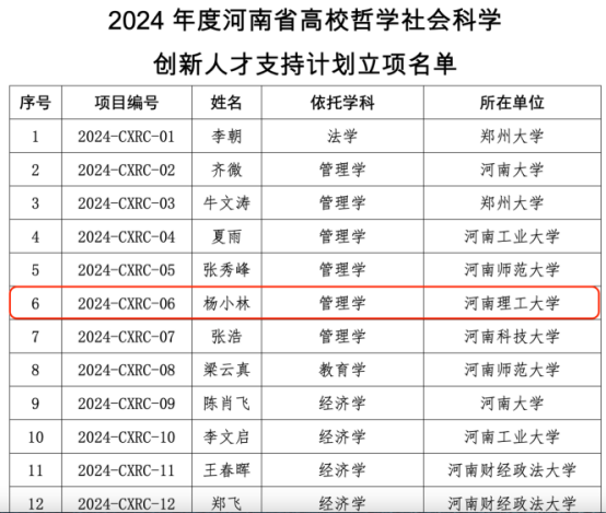 近日,河南省教育厅发布了《关于公布2024年度河南省高校哲学社会科学创新人才支持计划立项名单的通知》(教社语〔2023〕188号),我院杨小林副教授入选2024年度河南省高校哲学社会科学创新人才支持计划。
