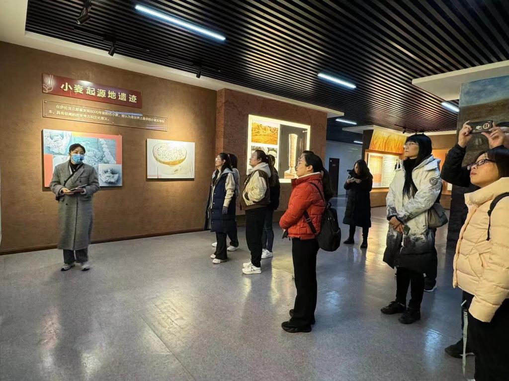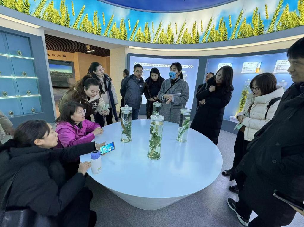 大家在讲解员的引导下,参观了温县小麦博物馆的各个展区。温县小麦博物馆是我国首座小麦专题博物馆,包括主场馆和体验园两部分,采用开放式仿汉建筑风格,馆内布展面积约3000平方米,主要采用实物、场景、互联网技术与现代声光电手段相结合的方式,综合展示小麦的起源、传播和发展,诠释源远流长的农耕文明和小麦文化。通过参观和体验麦之源、麦之脉、麦之梦、麦之乡四大展厅,大家对小麦的种植历史、小麦与中华文明的紧密关系有了更加深入的了解,充分感受到新中国成立以来,河南小麦的发展历程和全国地位。