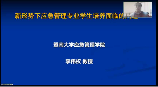 暨南大学公共管理学院副院长李伟权教授以《新形势下应急管理专业学生面临的问题》为题,从暨南大学应急管理办学经历、专业建设历程和专业培养面临问题三个方面做了简要介绍。他表示,应急管理专业建设应形成以政、产、教、研、学、用为主体的专业培养模式,推进资源整合和应急培养的一体化建设,提升学生能力通达各大行业,实现政产教研学用融合发展的教学体系。同时,应急管理专业人才培养上应建立“四实训练体系”,从实验、实践、实训、实习四个方面增强学生的应急综合素质,为国家输送高质量应急管理人才。最后,他指出当前应急管理专业培养上还存在应急教育配套设施匮乏、高层次师资力量不足、应急管理本土化与国家化等问题。