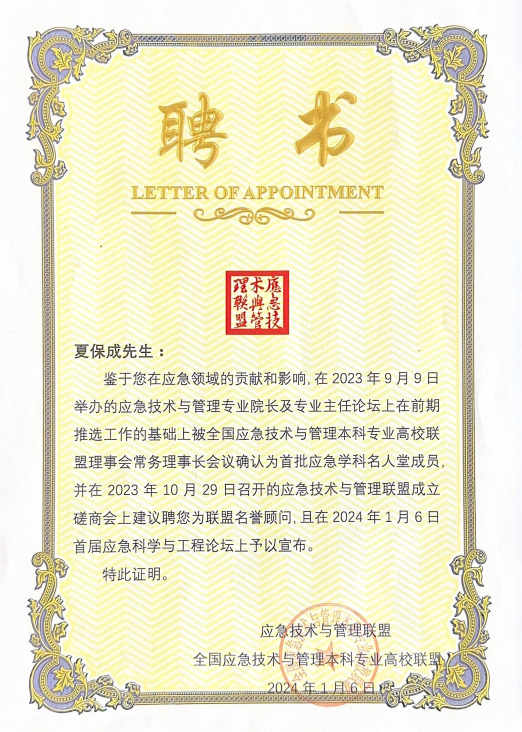 鉴于夏保成教授在应急领域的贡献和影响,在2023年9月9日举办的应急技术与管理专业院长及专业主任论坛上被被全国应急技术与管理本科专业高校联盟理事会确认为首批应急管理学科名人堂成员,在2023年10月29日召开的应急技术与管理联盟成立磋商会上建议聘为联盟名誉教授并于2024年1月6日正式颁发聘任证书。据悉,本次应急管理学科名人堂成员全国仅十人,均为安全与应急管理领域资深著名专家。