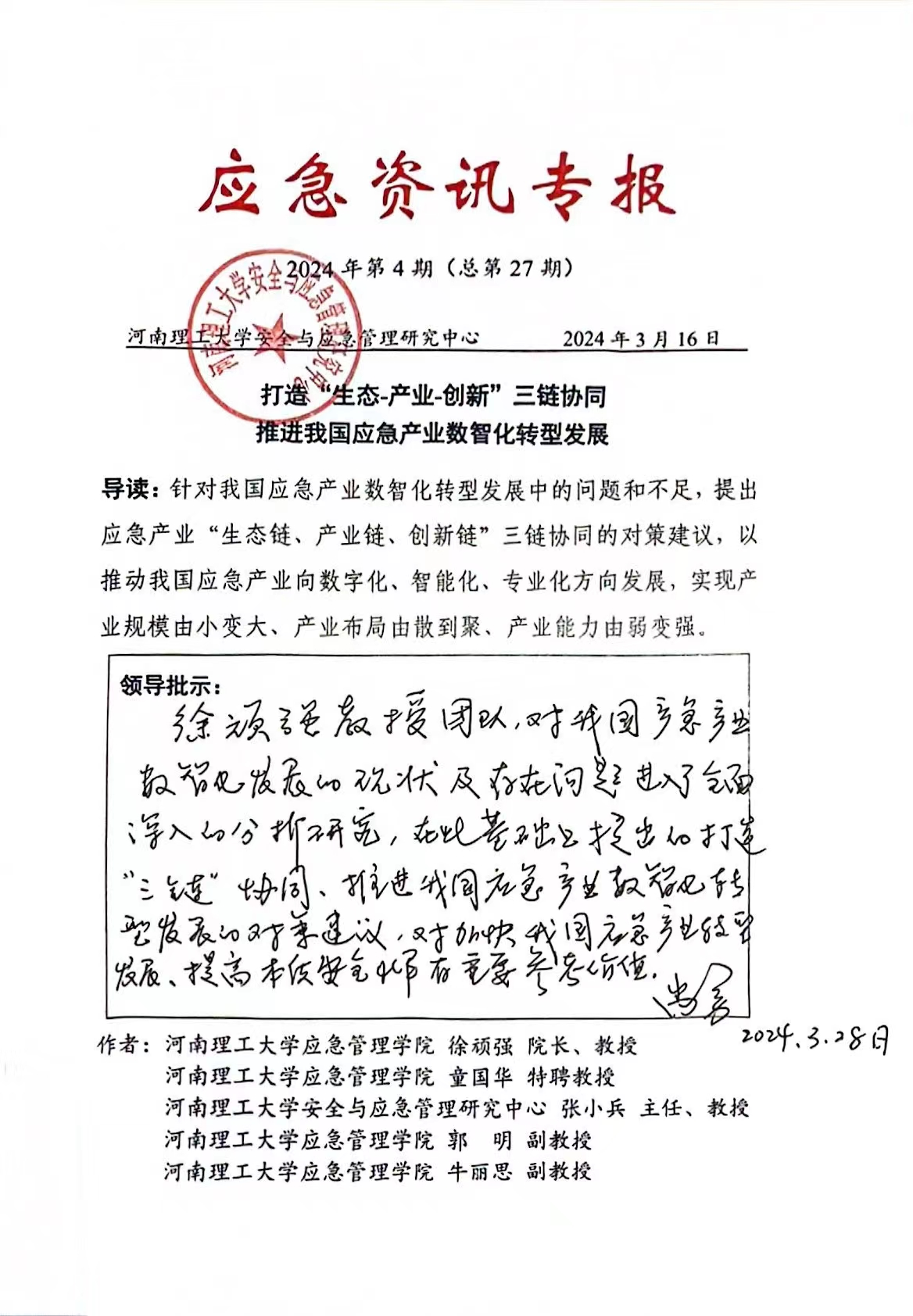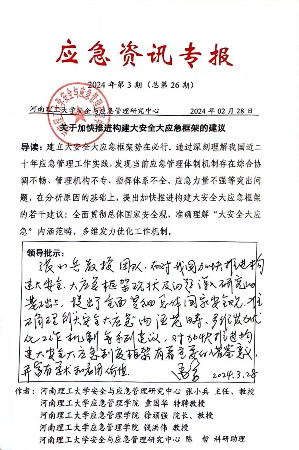 近日,我院徐顽强、张小兵教授领衔完成的研究报告《打造“生态-产业-创新”三链协同 推进我国应急产业数智化转型发展》《关于加快推进构建大安全大应急框架的建议》,通过智库渠道提交全国政协教科卫体委员会,得到了全国政协领导高度重视。全国政协常委、教科卫体委员会副主任兼教育组组长、应急管理部原副部长(正部长级)尚勇连续给予肯定性批示。