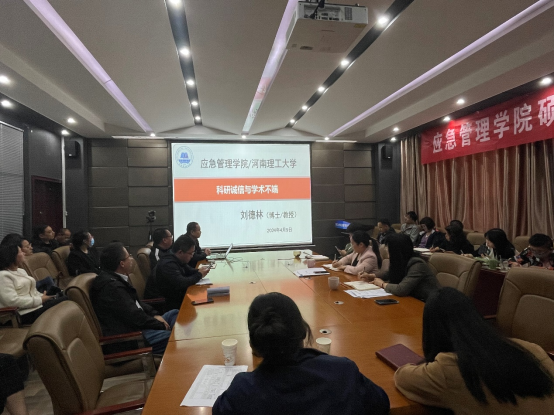 2024年4月9日下午,我院集中开展科研诚信教育与学术规范行为主题活动,邀请我院刘德林教授以“科研诚信与学术不端”为题做学术报告,科研副院长孔娜娜主持会议,全院教职工参加此次学习。