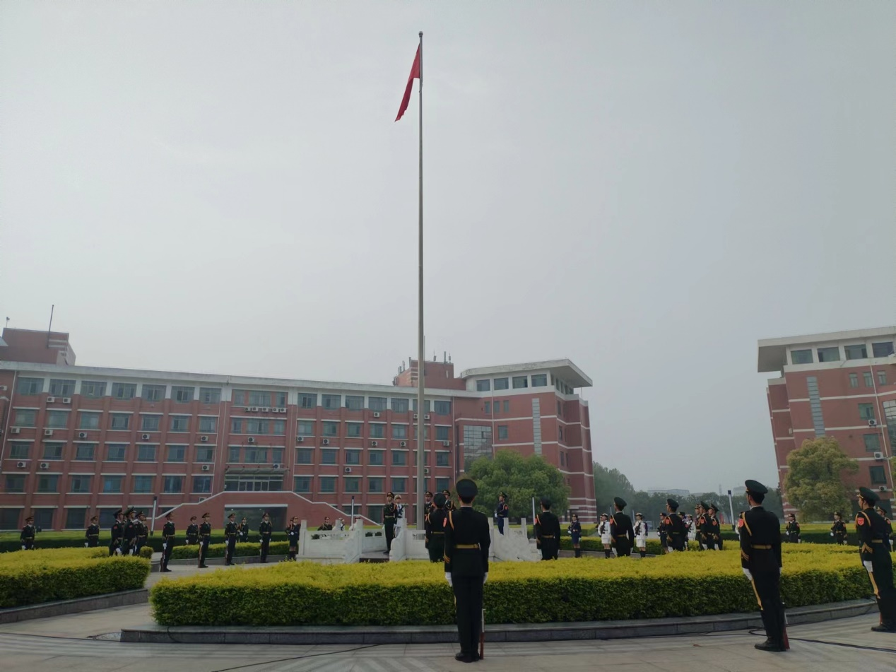 7时许,升国旗仪式正式开始。当雄壮激昂的国歌响起,鲜艳的五星红旗迎风飘扬,沐浴着晨光冉冉升起,全体师生庄严肃立,向国旗行注目礼。