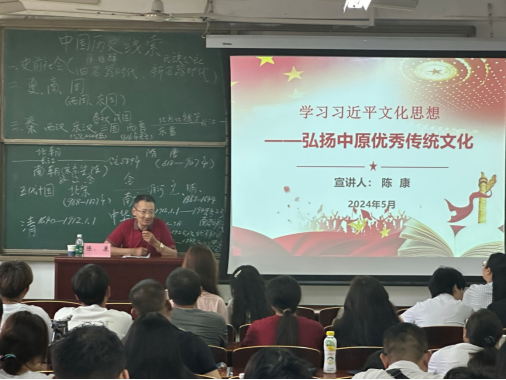 在讲座中,陈康以《学习习近平文化思想——弘扬中原优秀传统文化》为题,围绕“习近平文化思想的五个精髓”“中原优秀传统文化的主要内容”“在中部崛起的大格局中,努力贡献我们的青春与才华”三方面,详实地为大家阐述了中原文化的博大精深和中华民族深厚的文化底蕴,指出了传承与弘扬中原优秀传统文化,为增强中华儿女对传统文化的认同感和归属感、提高民族凝聚力提供了坚实的思想基础。同时,他强调,习近平文化思想是新时代党领导文化建设实践经验的理论总结,新时代新征程,广大师生要持续加强对习近平文化思想的学习、研究和阐释,着力赓续中华文脉,坚定文化自信,凝聚起万众一心的磅礴力量。