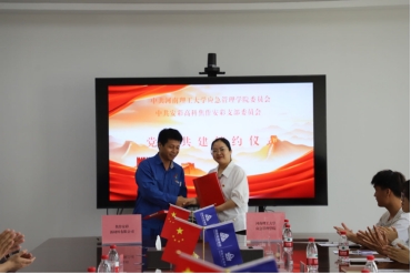 在热烈的掌声中,焦作安彩新材料有限公司党支部书记陈向飞与河南理工大学应急管理学院党委书记谢玉芬代表双方签署了《支部共建协议书》。该协议书的签署标志着双方党支部共建活动的正式启动,也预示着校企双方在党的建设、人才培养、科学研究等方面将开展更加紧密的合作。