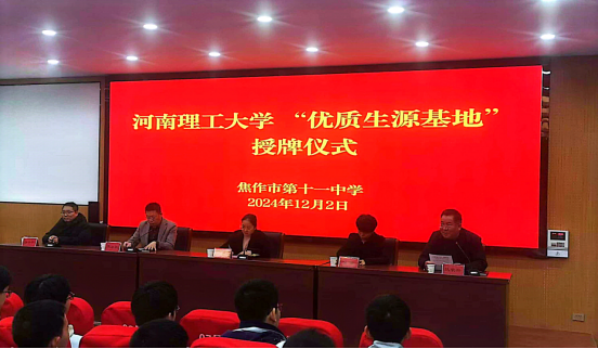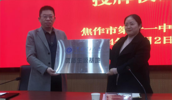 为扎实推进本科生招生宣传工作,进一步加强优质生源地建设,12月2日,我院党委书记谢玉芬带队赴焦作市第十一中学,共建“优质生源基地”并举行揭牌仪式。我院副书记任华、副院长揣小明、教科办副主任许荷袖、公共事业管理专业系主任李雯娟、应急技术与管理专业教师牛丽思,十一中党委书记苏小软、校长马荣兴及部分师生代表参加仪式,仪式由校长马荣兴主持。