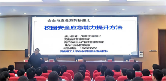 授牌仪式结束后,揣小明以《校园安全应急能力提升方法》为题给十一中学生代表作了一场精彩的专题科普报告。他围绕校园安全现状分析、社会对校园安全的态度及校园安全应急能力的提升方法三方面进行了详细讲解。报告受到同学们的热烈欢迎。