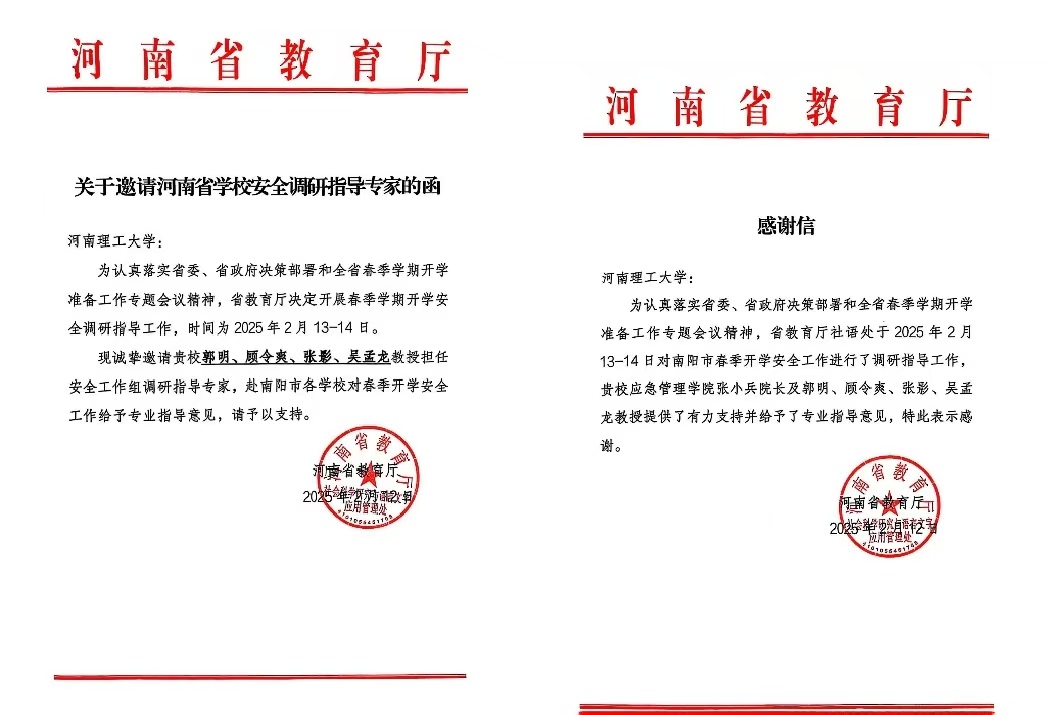 为认真落实省委、省政府决策部署和全省春季学期开学准备工作专题会议精神,2025年2月14日,河南省教育厅社语处组织开展南阳市春季开学安全工作调研指导活动。我院郭明、顾令爽、张影、吴孟龙四名教师受邀作为专家组成员,全程参与了此次开学安全调研指导活动。