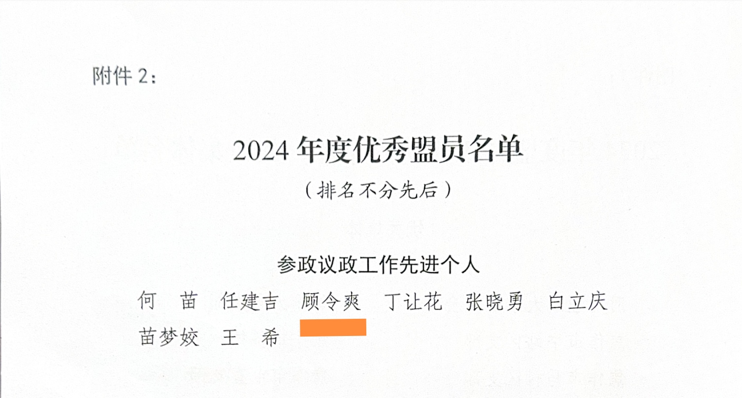 近日,民盟焦作市委员会发布《关于表彰2024年度盟务工作优秀集体、先进集体和优秀盟员的决定》(盟焦[2025]1号),我院顾令爽老师荣获“2024年度参政议政工作先进个人”荣誉称号。