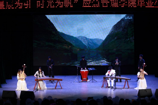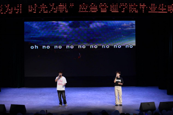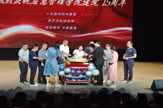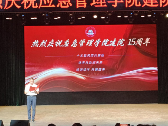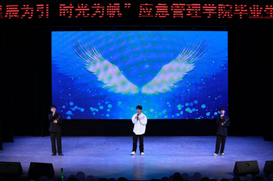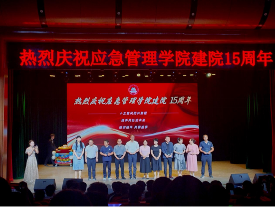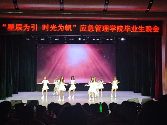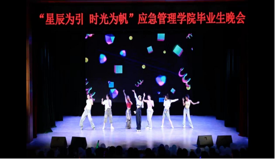 晚会伊始,大屏幕播放学院全体领导、教师代表和辅导员老师们对毕业生们的祝福视频,他们深情回顾了同学们在校园里的成长历程,表达了对毕业生未来的美好祝愿,并鼓励大家在未来的道路上,继续保持青春的激情和拼搏的精神。随后,晚会以一支活力四射的开场舞《恋爱告急》中拉开序幕,跃动的节奏瞬间点燃现场氛围。随后,歌曲《你从未离去》以温暖的旋律唤起同窗情谊的共鸣,舞蹈《云与海》用柔美身姿演绎青春的辽阔与深邃。相声《论捧逗》以幽默诙谐的对话引得全场笑声不断,青年志愿者协会以手势舞《微微》传递奉献精神,展现了应急学子多才多艺的一面。适逢应急管理学院建院15周年,主持人深情致贺:“十五载风雨兼程,十五载桃李芬芳。愿学院在新时代的征程中再创辉煌!”伴随着《生日快乐》钢琴曲,学院领导与师生代表共同推上庆典蛋糕,张小兵致辞回顾建院历程,勉励师生“继往开来,砥砺前行”,学院领导为建院十五周年优秀教师代表颁发“砥砺十五年·应急守望者”奖杯。在全场掌声中,师生代表携手切下蛋糕,将晚会推向温馨高潮。舞蹈《fire star》以炽热舞步诠释青春激情;说唱《迷途的羔羊》用铿锵节奏呐喊出青年对未来的思考;民乐合奏《浮光》则用传统韵律展现文化自信。尾声阶段,歌曲《一程山路》以悠扬旋律为晚会画上圆满句号,寓意毕业生们“山高路远,终有重逢”。