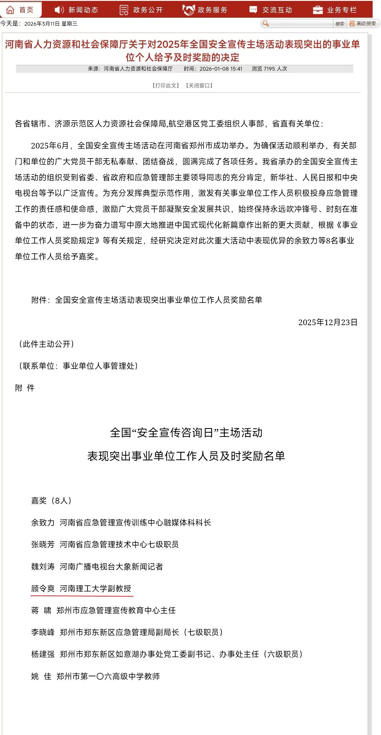 近日,河南省人力资源和社会保障厅根据《事业单位工作人员奖励规定》等有关规定,经研究决定对此次重大活动中表现优异的8名事业单位工作人员给予嘉奖。民盟河南理工大学委员会副主委、民盟焦作市委员会科技和社会委员会副主任、应急管理学院副教授顾令爽获得嘉奖。