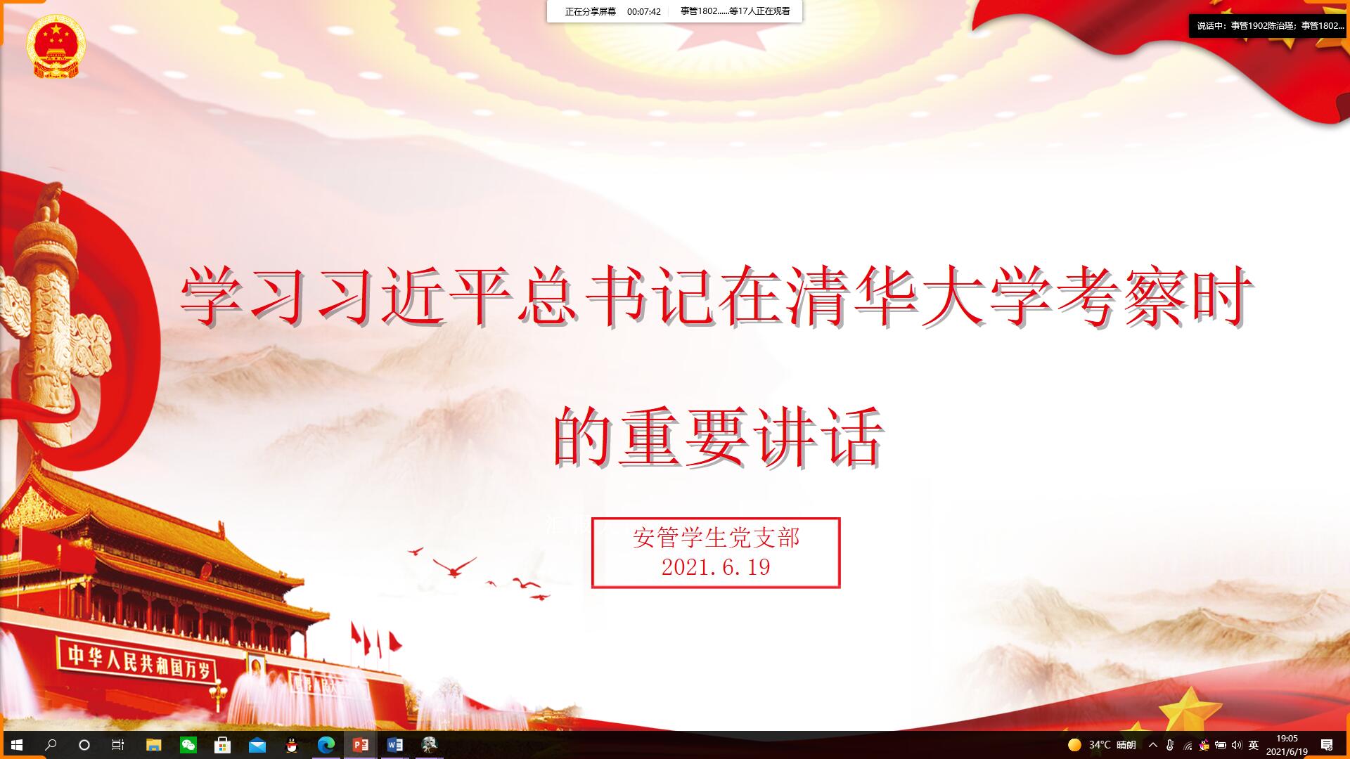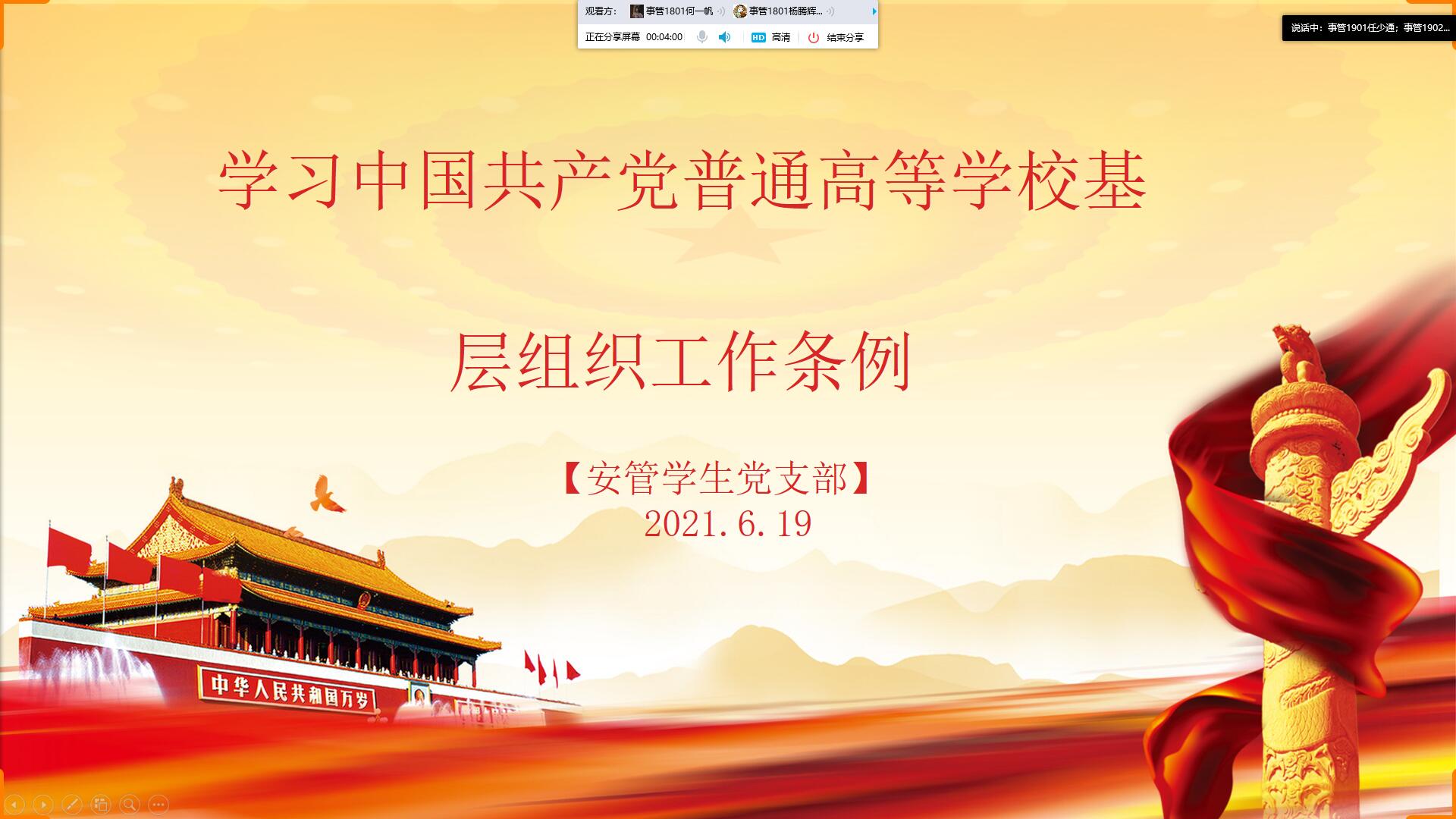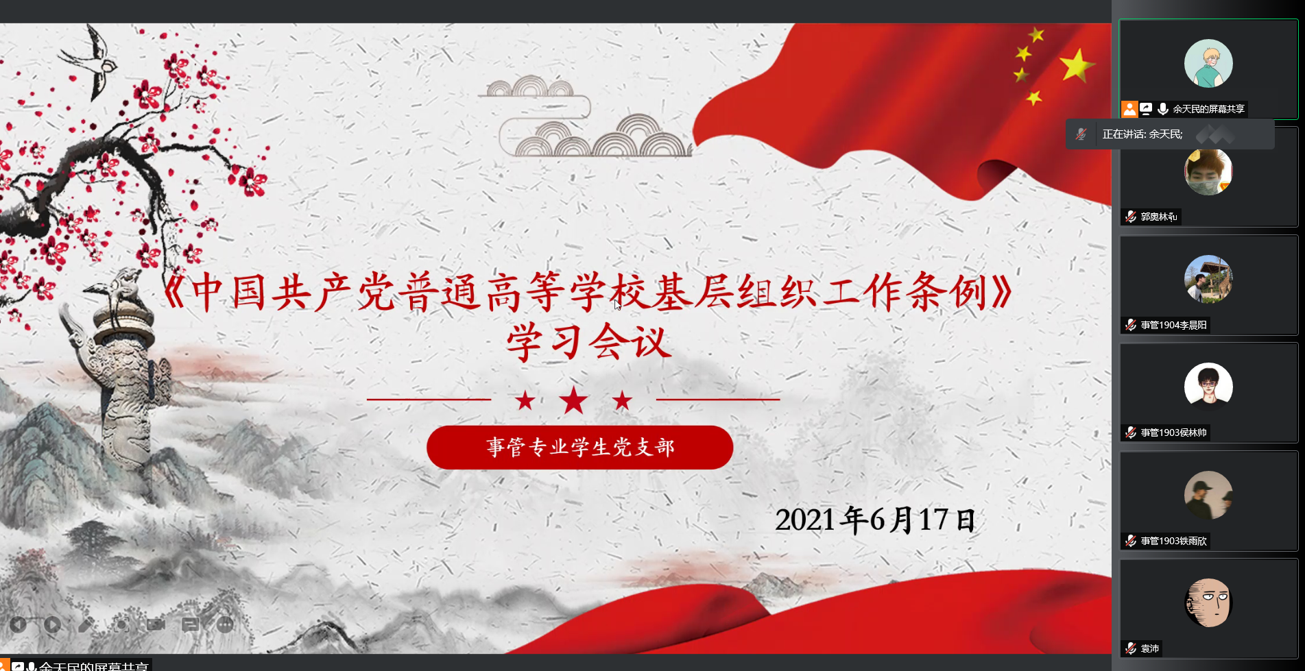 为加强基层党的建设,坚定党员理想信念,6月中旬,我院各学生党支部自发开展了学习《中国共产党普通高等学校基层组织工作条例》暨重温“习近平总书记在清华大学考察时的重要讲话精神”专题学习会议,所有党员、预备党员参与本次学习会议。
