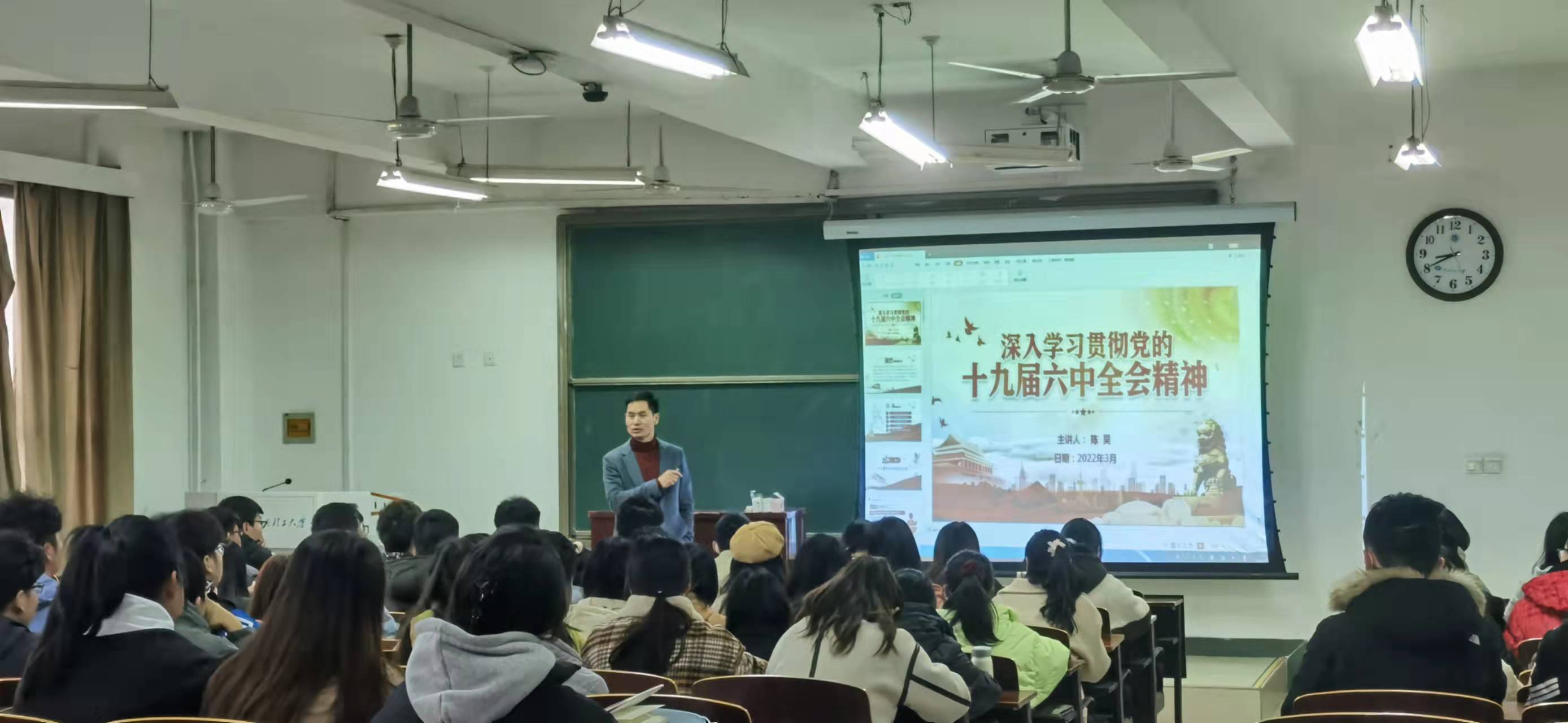 会议伊始,陈昊指出党的十九届六中全会是在我们党成立一百周年的重要历史时刻,在党和人民胜利实现第一个百年奋斗目标、全面建成小康社会,正在向着全面建成社会主义现代化强国的第二个百年奋斗目标迈进的重大历史关头召开的重要会议。随后他围绕十九届六中全会会议介绍、党的百年奋斗重成就、党的百年奋斗历史意义、党的百年奋斗历史经验及不忘初心推进中华民族伟大复兴五个方面进行全面的讲解,重点阐述了“四个伟大成就”“两个确立”“一个根本问题”“五大历史意义”“十个坚持”等全会核心内容。最后,他号召广大学生要深刻把握实现中华民族伟大复兴这一鲜明主题,弘扬光荣传统、赓续红色血脉,把自己的小我融入祖国的大我、人民的大我之中,努力学习各项知识,与时代同步伐、与人民共命运。
