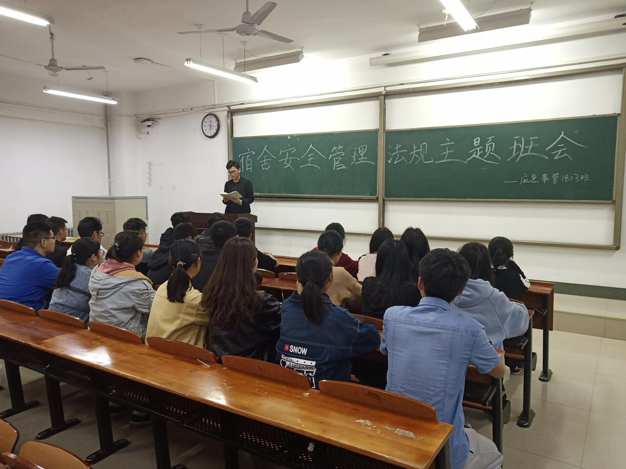 为进一步加强学生宿舍安全管理教育,使学生有一个更安全舒适的生活环境,3月26日下午,应急管理学院组织各班级开展学习最新修订宿舍安全管理法规会议。会议由各班级负责人主持,16级、17级、18级全体学生参加。