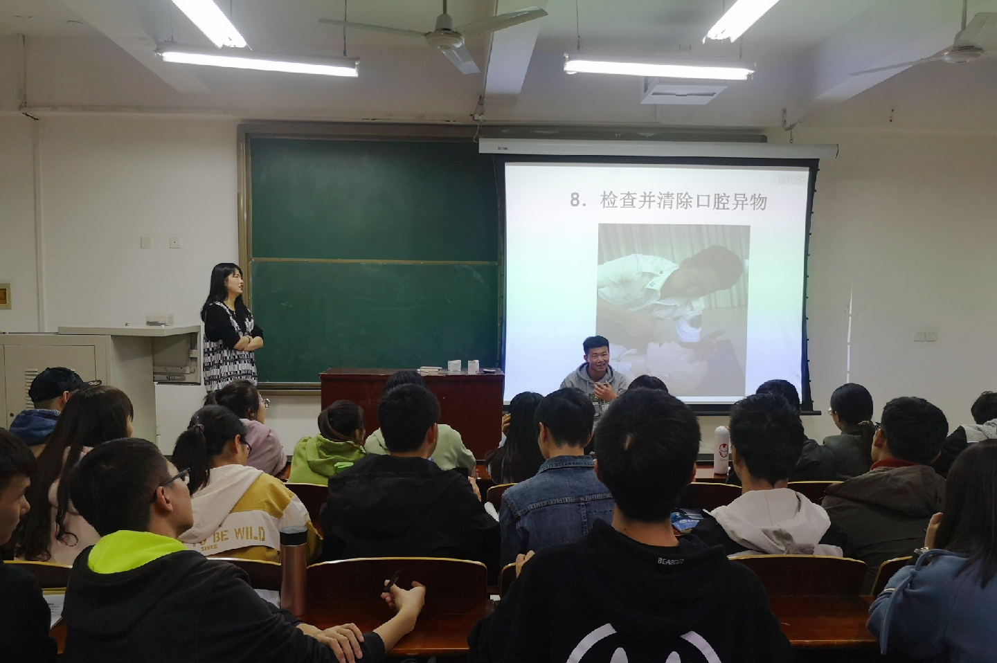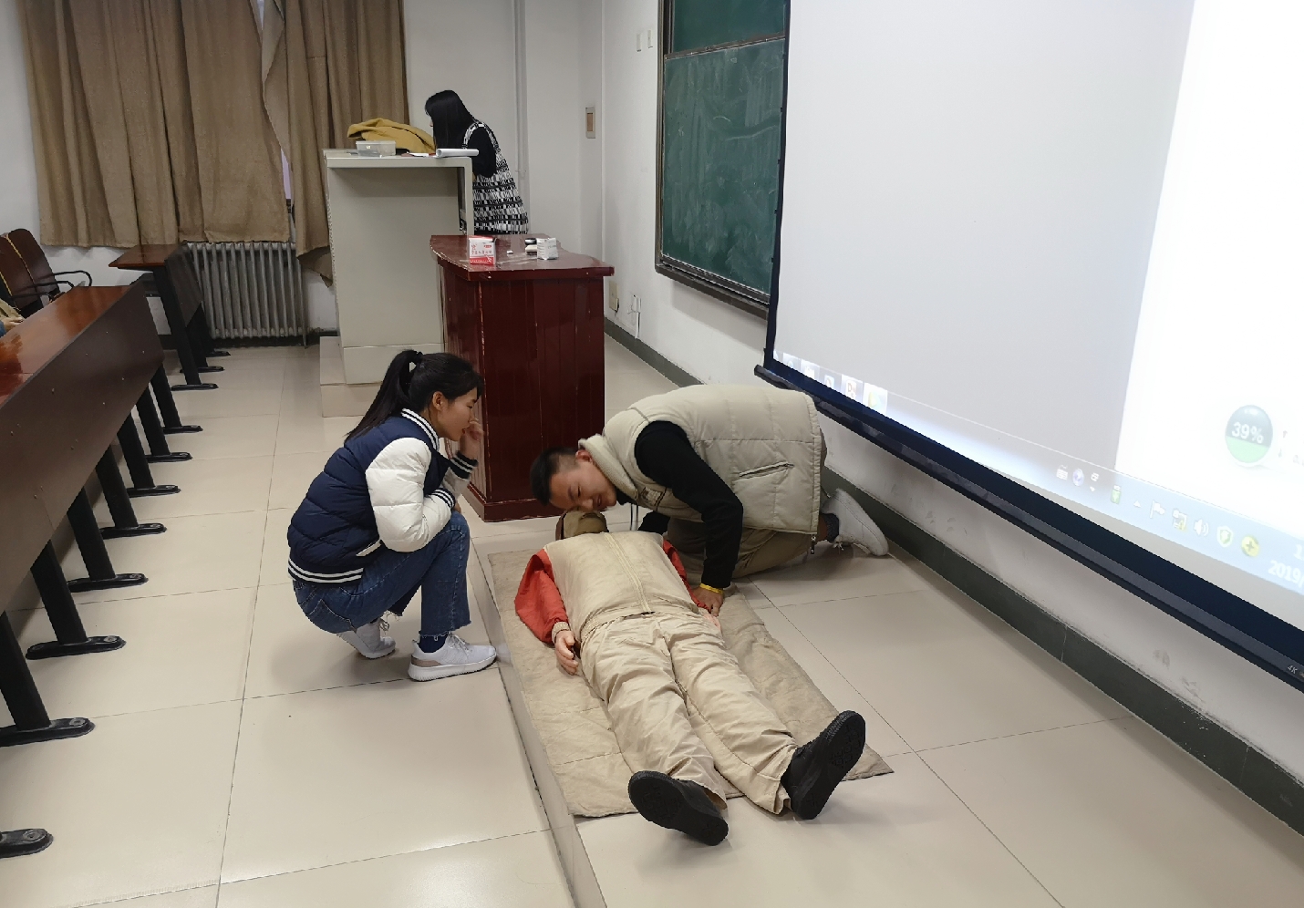 为了进一步培养学生应急意识,加强应急宣传教育,提高学生参与自救互救能力,学院开展了“学.行.践”国家安全观第30期一CPR走进课堂。 2019年11月15日,河南理工大学应急救援队副队长田帅凡和李雯娇琦一同到文综楼510教室为材料学院部分大四同学讲解了心肺复苏相关知识。