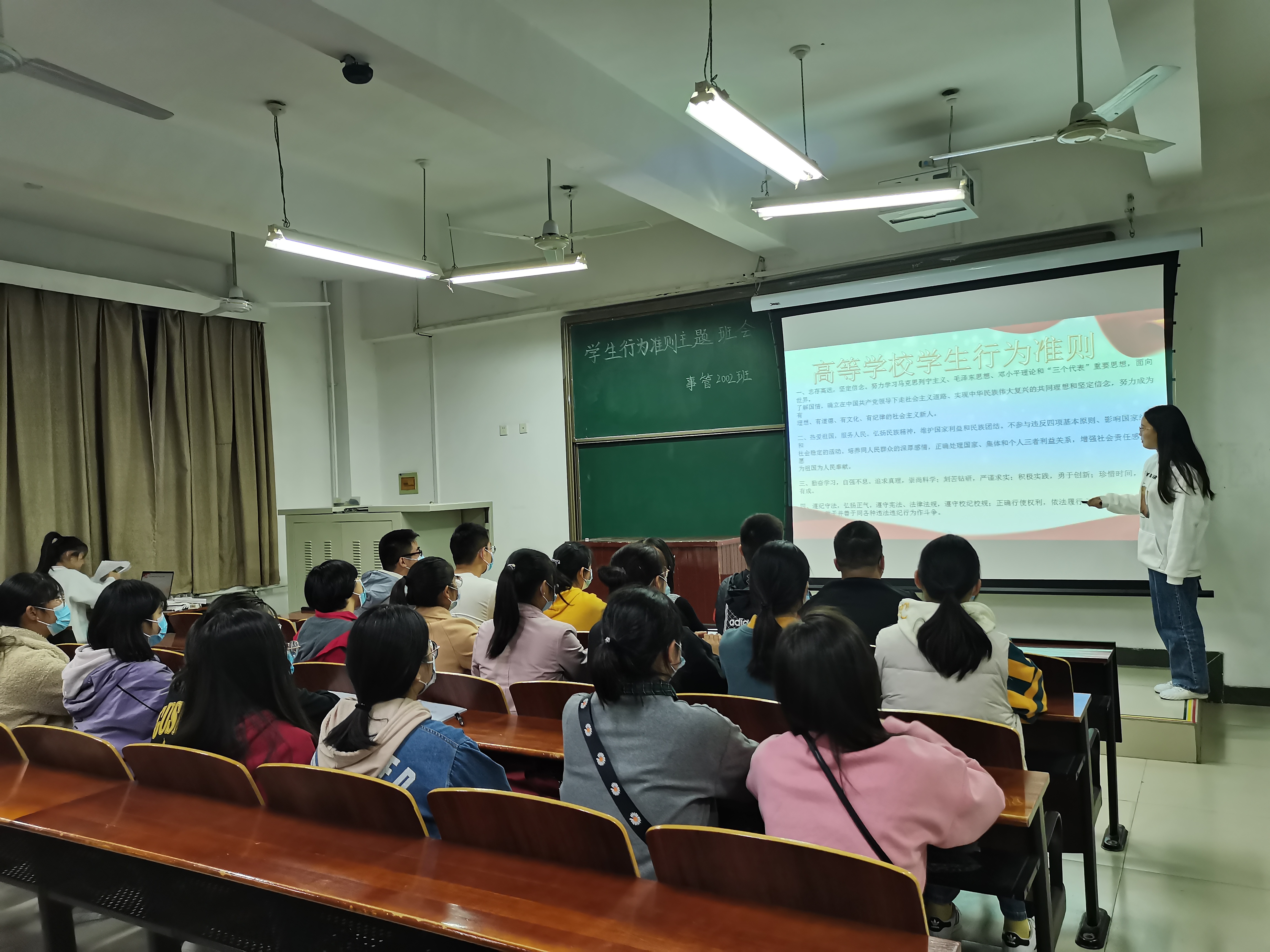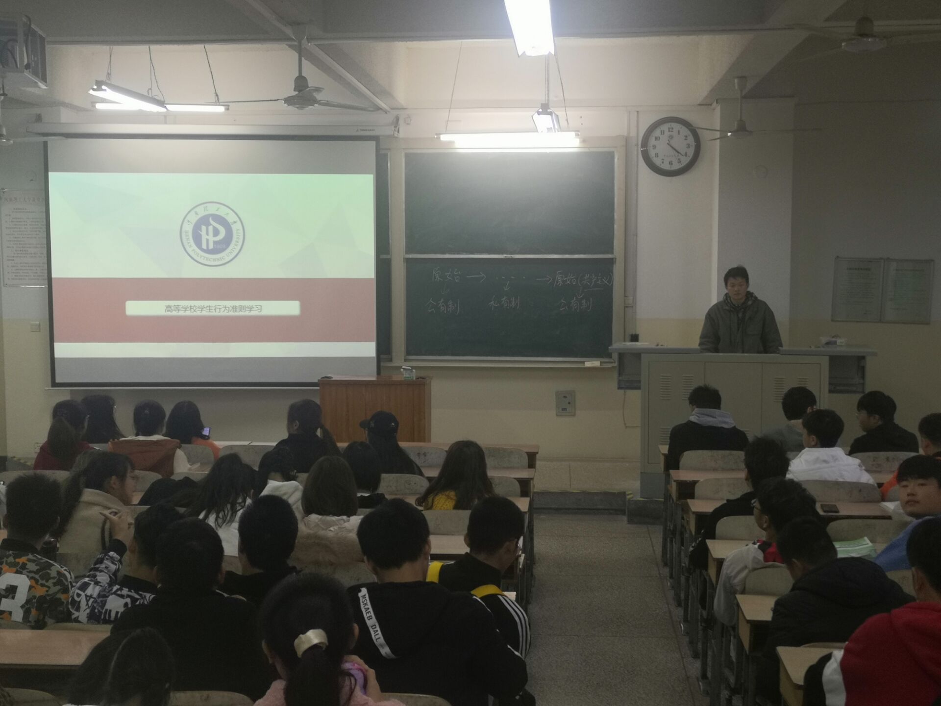 为了加强了同学们的思想政治工作,引导同学们树立坚定的理想信念,我院积极响应学校号召,以班级为单位召开了“高等学校学生行为准则学习”主题班会,18、19、20级全体学生参与。