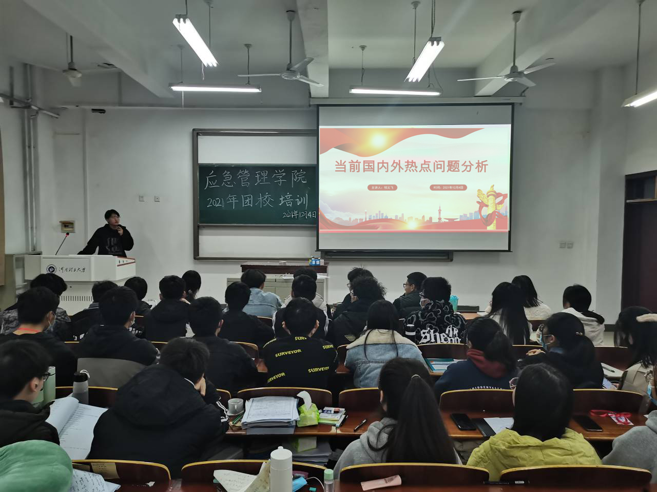 12月10日晚,应急管理学院在文综楼509教室开展“当前国内外热点问题分析”主题团校培训会,会议由学院团委副书记祁义飞主持,2021级团支部委员、2020级新任团干部和学院“青马班”全体学员参与仪式。