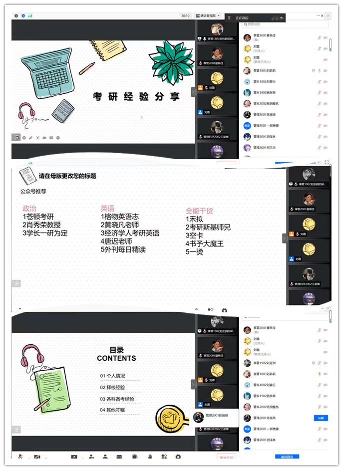 为了进一步提高我院学生的考研热情,明确考研目标,掌握相关考研技巧,了解更多考研信息。5月8日,应急管理学院举办学风建设系列活动之“聚焦考研,分享经验”经验交流会。本次交流会诚邀2022届考研中优秀学子代表2018级邹瑜、刘莉莉、刘善行等参与会议并分享经验,19级部分同学和20级全体同学参与会议。