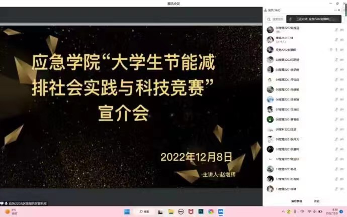 12月8日,应急管理学院线上召开“大学生节能减排社会实践与科技竞赛”宣介会。宣介会由该院团委科创实践部部长杨欢欢、干事赵增辉主讲,该院20、21级科创委员和22级全体学生参加宣介会。