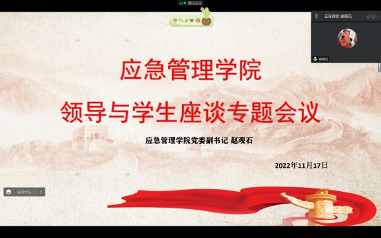 为帮助学生解决实际问题,加强学生疫情防范意识,守护学生身心健康与生命安全,11月17日下午,应急管理学院通过线上会议开展领导与学生座谈专题会议,学院党委副书记赵观石及2020级学生代表出席本座谈会。