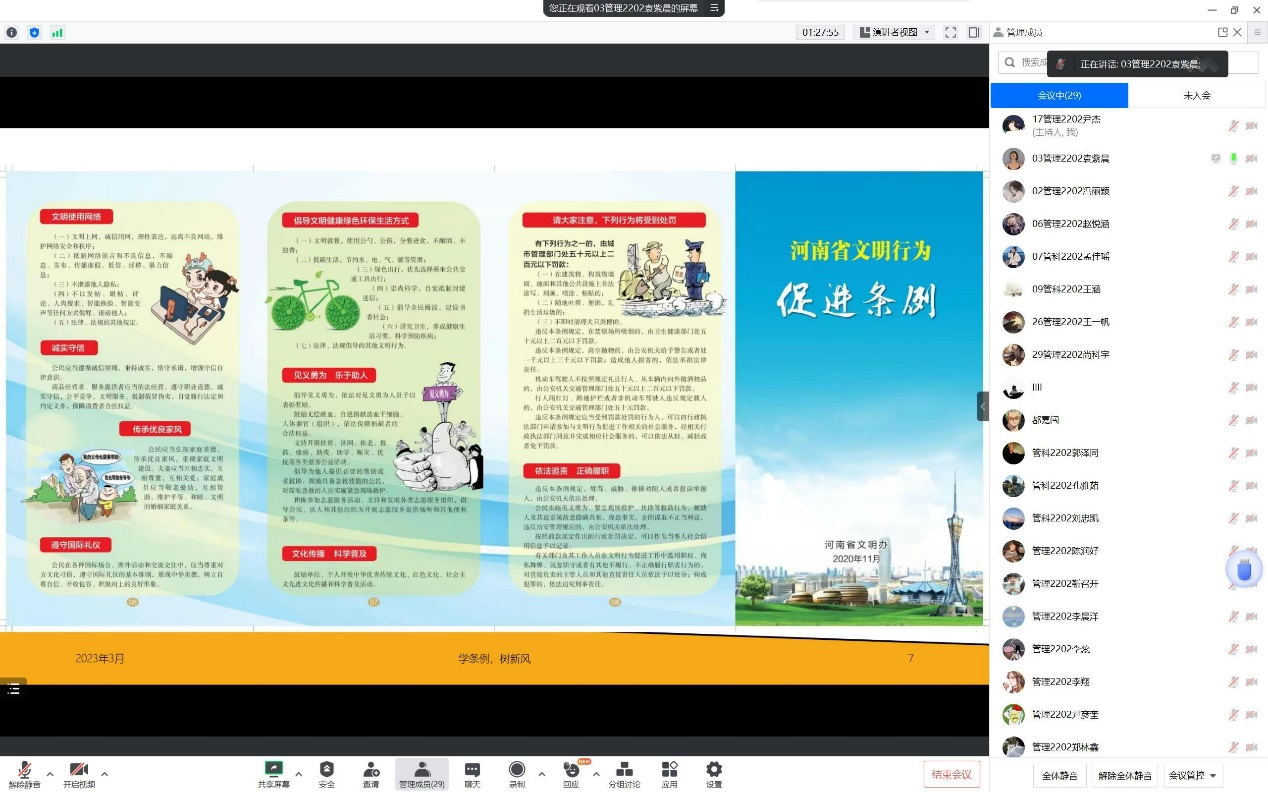 本次主题学习活动的顺利召开,不仅让学生学习了《条例》的相关知识,还引导学生坚持树立文明理念、自觉养成文明习惯,宣传文明行为规范,为营造学院良好学风,助力建设文明校园夯实了共同思想基础。