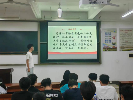 活动伊始,每班的主讲人进行介绍与宣传,同学们积极参与发言讨论,通过PPT讲解、观看视频、个人讲解、小组讨论的形式来进行主题宣传。深入贯彻落实党的二十大精神,引导大学生立足实际、找准定位,树立理性、平实的择业观、就业观,主动到基层一线“自找苦吃”、踏实奋斗、成长成才。然后,现场进行答辩环节,评委就参赛团支部的申报表、策划书、总结书和现场表现进行点评指导,指出优缺点并提出修改建议。最后,同学们在活跃的氛围中了解深入此次班会的核心思想。不少同学表示对自己有了更为清晰的职业规划,开始客观看待个人条件和社会需求,从实际出发,选择职业和工作岗位。