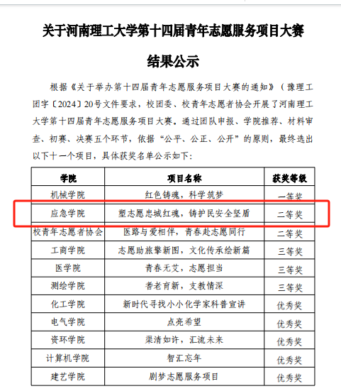 交织应急特色,赓续红色文化。以红色精神为指引,助应急宣传远航。5月28日下午,我校第十四届青年志愿服务项目大赛决赛于综合实验楼102顺利举行。应急管理学院青年志愿者协会在11支决赛队伍中脱颖而出,载誉而归,斩获河南理工大学第十四届青年志愿服务项目大赛全校第二名(二等奖)的可喜成绩。