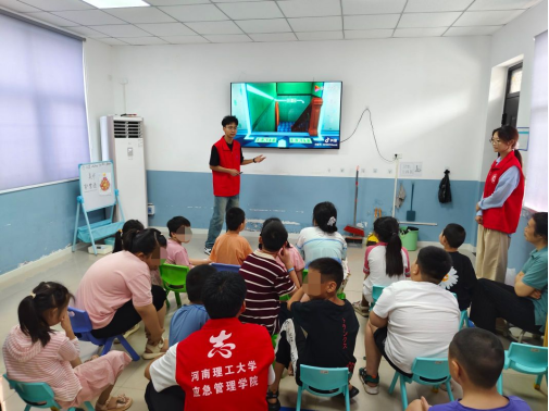 为防范中暑风险,学习地震逃生技巧,共铸生命安全之盾,2024年7月19日,河南理工大学应急管理学院志愿者们来到金蕊儿童康复中心,给小朋友们带来了一堂生动的安全教育课。